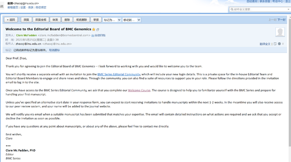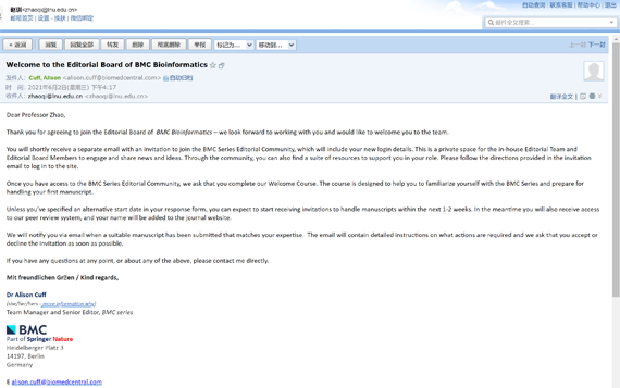 近日,J9平台计算机与软件工程学院教授赵琪收到BMC出版集团Dylan Smith博士邀请,受邀分别担任BMC Genomics和BMC Bioinformatics编委。