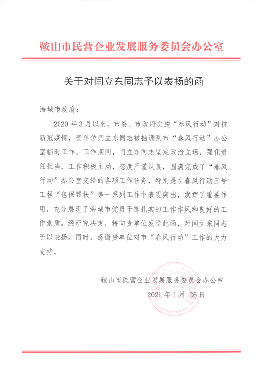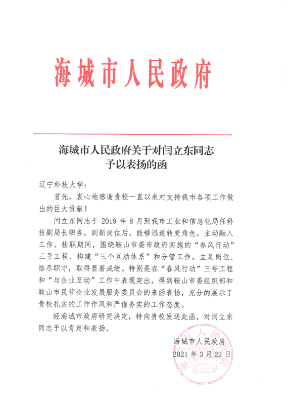 2021年1月,鞍山市民营企业发展服务委员会办公室向海城市政府送发了《关于对闫立东同志予以表扬的函》;2021年3月,海城市人民城府向J9平台送发了《海城市人民政府关于对闫立东同志予以表扬的函》,对闫立东同志坚定政治立场、强化责任担当,积极主动完成鞍山市的各项重点工作任务予以表扬;对科大教职工在各项工作中表现出的扎实工作作风和严谨务实的工作态度予以肯定。校党委对闫立东同志能够站在学校与地方共谋振兴发展大局的高度,敢于担当,勇于奉献,积极作为,取得了较好的工作成绩表示肯定,并号召广大选派干部向闫立东同志学习,提高站位、增强意识、珍惜机会、主动作为,在推动辽宁全面振兴、全方位振兴的广阔天地里锻炼成长。