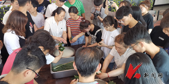 在详细介绍了端午节的由来和文化内涵后,师生们共同参与包粽子活动。一时间,粽叶舞动、绳线穿梭、欢歌笑语。师生们在专业师傅的耐心指导和细致演示下,从一开始的无从下手到较熟练地掌握包粽子的要领和技巧,捋粽叶、装糯米、放辅料、裹粽子……一气呵成。看着自己的劳动成果,喜悦之情溢于言表,大家纷纷拿出手机拍照合影、发朋友圈,欢笑声久久回荡。