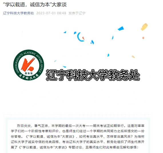 为确保考试公平、公正、和谐进行,考前,由教务处牵头制定了期末考试工作方案,召开了期末考试工作会,学校相关职能部门和各教学单位共同研究部署期末考试的各个具体环节。在教务处、学生处、校团委以及各教学单位的共同努力下,学校面向全体考生开展“‘学以载道,诚信为本’大家谈”活动,从不同角度发出了“诚信考试”的声音,以此进一步加强学校考风考纪教育。(供稿单位:教务处 作者:王艳 图片来源:教务处)
