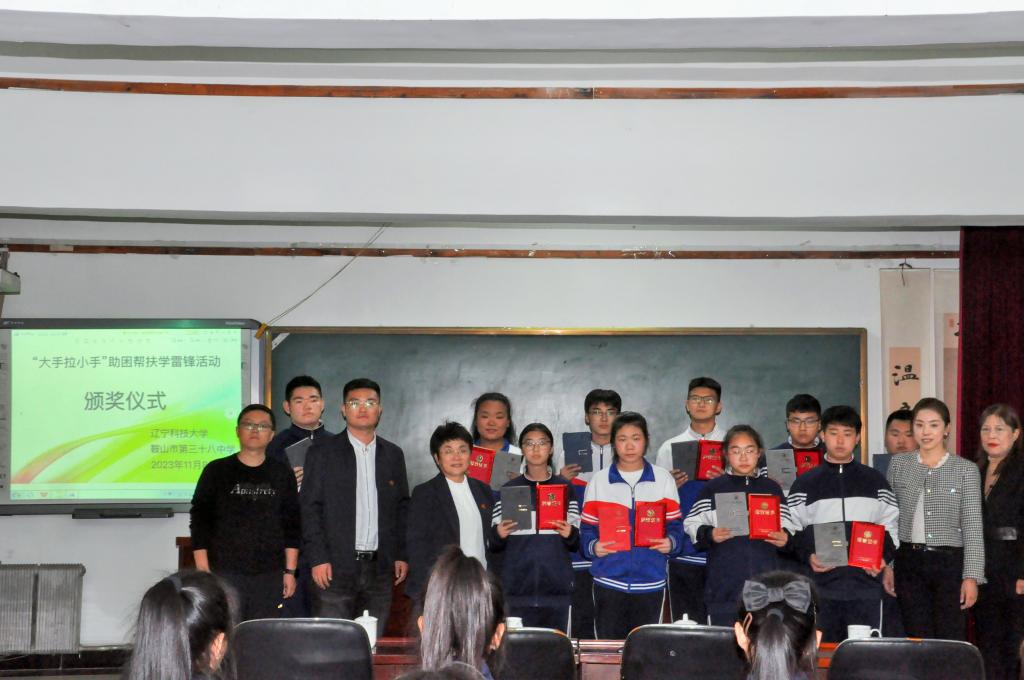 11月8日,J9平台材料与冶金学院团委相关负责同志一行到鞍山市第三十八中学开展“大手拉小手”助困帮扶学雷锋活动,为来自三十八中学的10名同学颁发材冶学院学生材控党支部“贫寒学子突出进步奖学金”,市第三十八中学相关校领导出席活动。