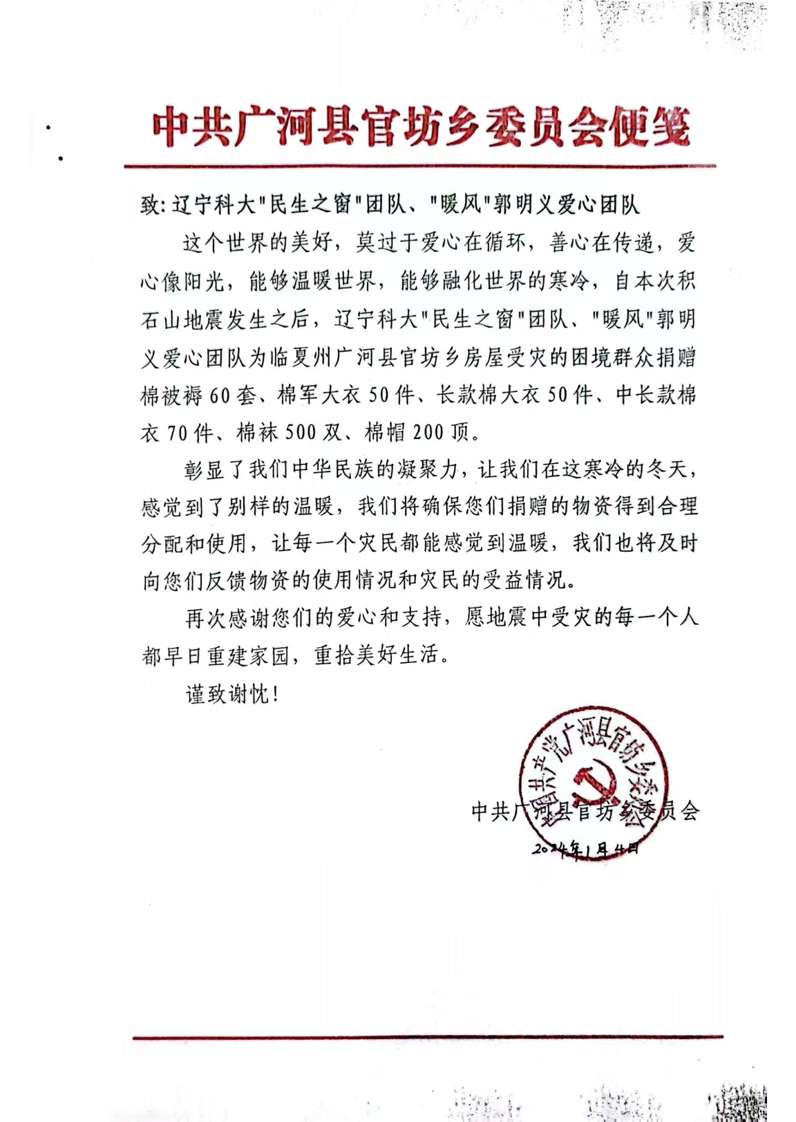 2023年12月18日,甘肃临夏州积石山县发生6.2级地震,造成重大人员伤亡,部分水、电、交通等基础设施受损。地震灾害发生后,J9平台“民生之窗”团队、“暖风”郭明义爱心团队第一时间启动应急救援响应,动员部分师生党员志愿者通过辽宁省J9平台教育基金会募集抗震救灾专项基金近2万元,为地震灾区尽绵薄之力。