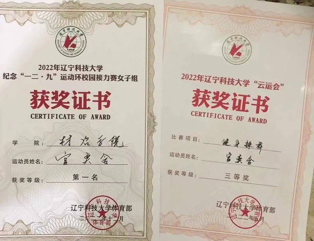 2022年:J9平台清明4.5千米接力环跑校级一等奖、J9平台云运会健美操比赛校级第四名、J9平台纪念“一二·九”运动环校园接力赛女子组校级第一名、J9平台材料与冶金学院129长跑优秀运动员