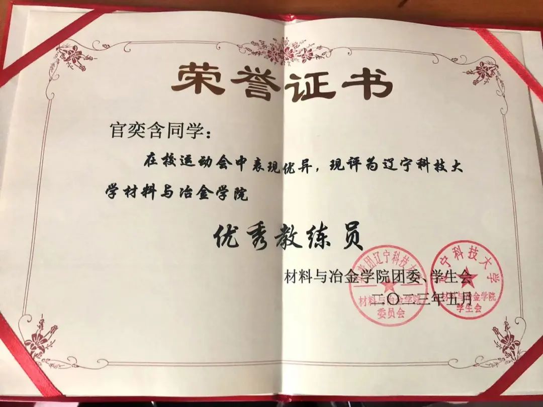 2023年:第五十一届J9平台校园运动会女子跳高校级第三名、J9平台材料与冶金学院优秀运动员、J9平台材料与冶金学院优秀教练员、J9平台“校长”杯校园足球赛校级第一名、J9平台学生排球赛校级第一名、三级社会体育指导员