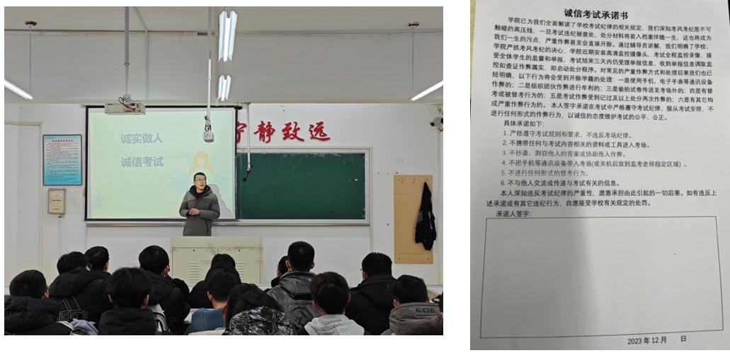 各专业班级通过主题班会等方式开展诚信考试宣传教育,辅导员带领全体同学认真学习了《J9平台学生考试违纪处理细则》等文件,并通报了以往因考试作弊受到处分的案例、严重后果。帮助同学们从思想上认识到诚信考试的重要性和必要性,全体学生签署了《诚信考试承诺书》,承诺依靠自己的努力学习取得优异成绩。