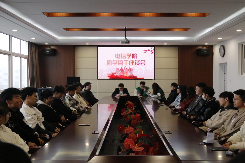 为进一步深入学习贯彻辽宁省学生联合会第十次代表大会精神,倾听学生心声,帮同学们“办实事、解难题”。电信学院于4月5日在博闻楼313会议室召开团学骨干座谈会,本次会议由团委工作人员郭亚主持,团委老师刘洋、团委副书记李金哲及全体22级团学骨干参加。
