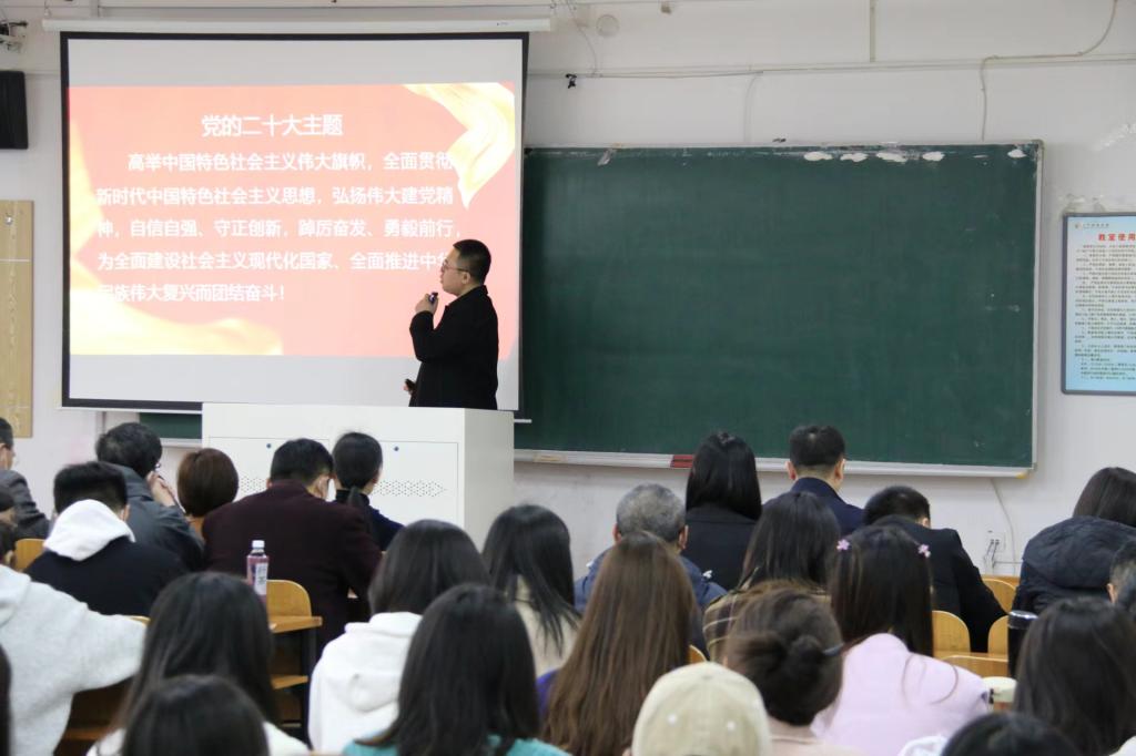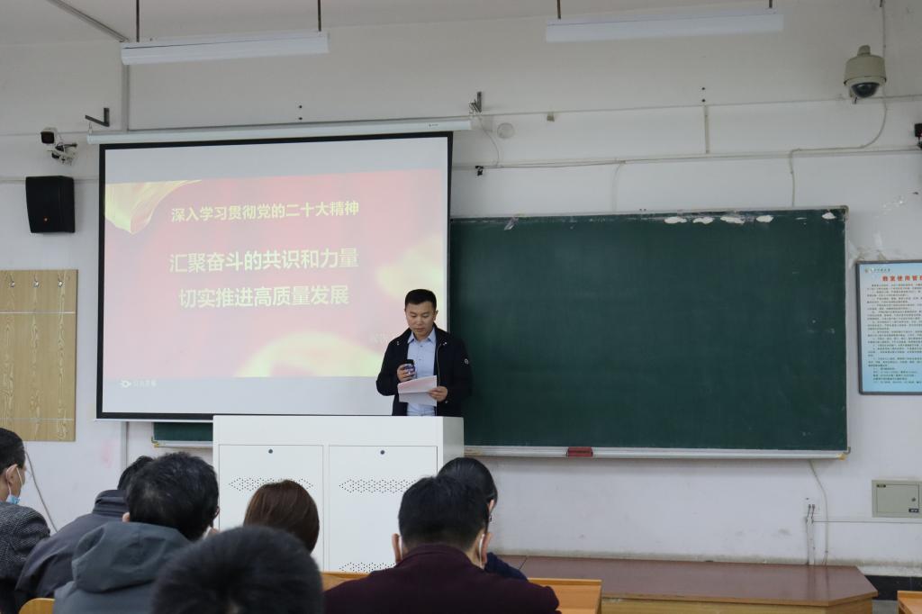 为深入学习宣传贯彻党的二十大精神,落实好《中共J9平台委员会关于深入学习宣传贯彻党的二十大精神的方案》,3月28日下午,工商管理学院党委于博学楼C108教室主持召开学习贯彻党的二十大精神宣讲报告会,会议由管理学院党委书记董文武主持,管理学院师生代表、继续教育学院、科技园教职工代表参加。