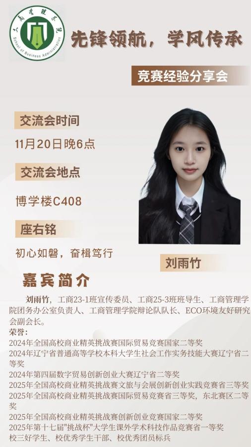 刘雨竹,现任工商23-1班宣传委员、工商25-3班班导生、工商管理学院团务办公室负责人、工商管理学院辩论队队长、ECO环境友好研究会副会长。曾获2024年全国高校商业精英挑战赛国际贸易竞赛国家二等奖、2024年辽宁省普通高等学校本科大学生社会工作实务技能大赛辽宁省二等奖、2024年第四届数字贸易创新创业大赛辽宁省二等奖、2025年全国高校商业精英挑战赛文旅与会展创新创业实践竞赛省三等奖、2025年全国高校商业精英挑战赛国际贸易竞赛省三等奖,东北赛区二等奖、2025年全国高校商业精英挑战赛创新创业竞赛国家二等奖、2025年第十七届"挑战杯"大学生课外学术科技作品竞赛省一等奖、校三好学生、校优秀学生干部、校优秀团员标兵。