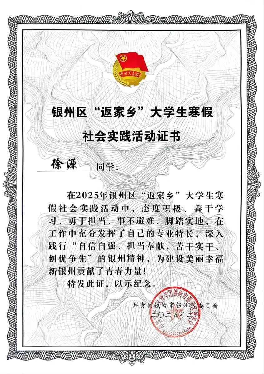 寒假“返家乡”社会实践期间,我参与了冰雪嘉年华志愿服务、青春护河行动、文明实践活动等一系列工作,在为家乡发展贡献力量的同时,也提升了自身能力。通过社会实践活动,我的沟通、组织和团队协作能力得到了显著提高,社会责任感进一步增强,对家乡的认识也更加深刻。我也发现了自己在活动策划方面的不足,未来需要加强学习。