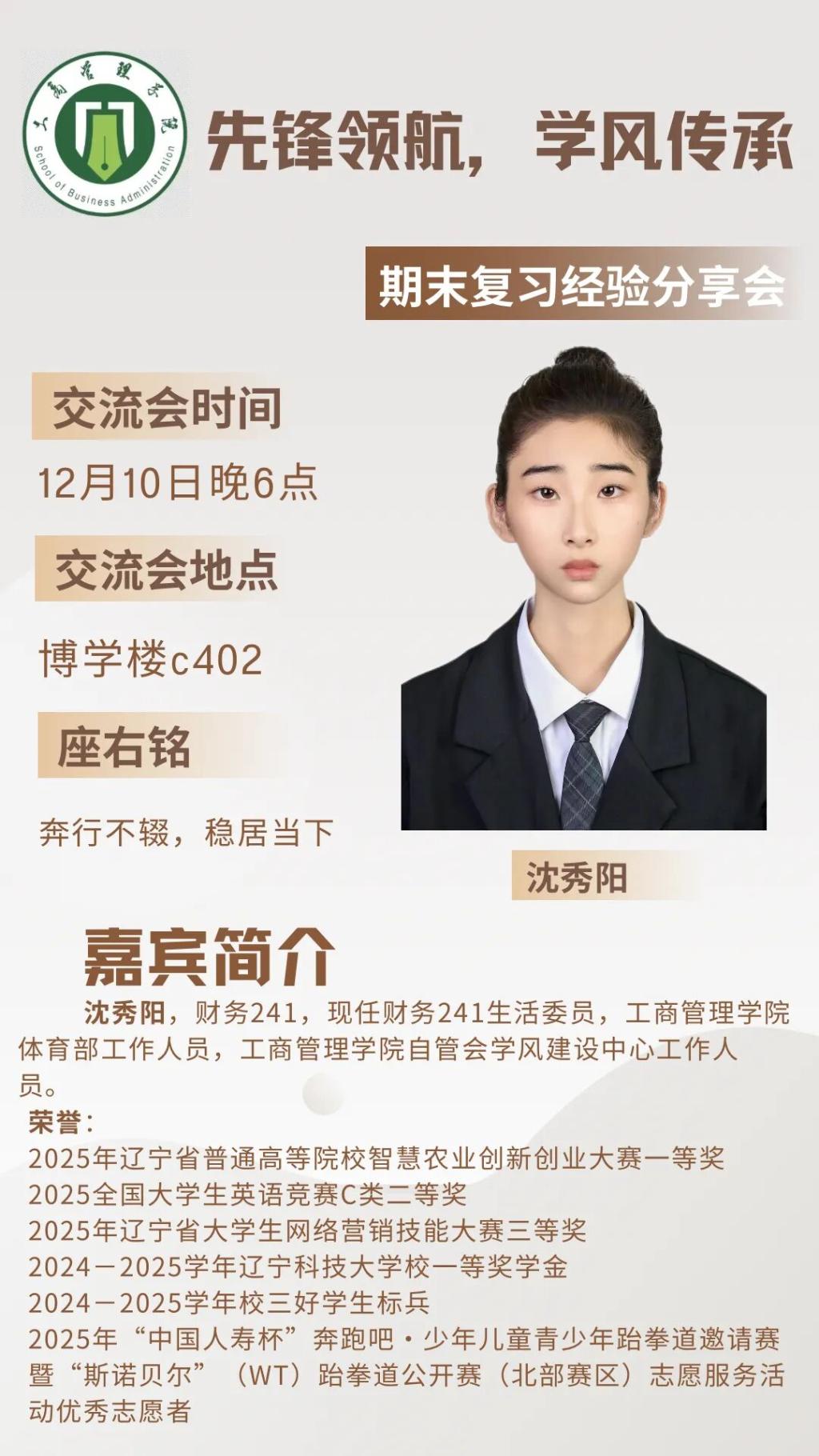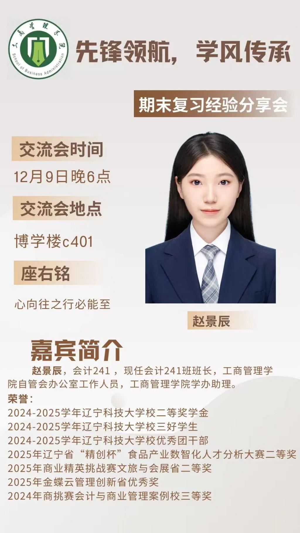 为深入贯彻“先锋领航,学风传承”的理念,引导新生在学业中稳步前行,工商管理学院“先锋领航,学风传承”系列宣讲之“期末复习经验分享会”将于12月10日举行。本次活动邀请到沈秀阳、赵景晨两位优秀学姐,为大一同学们分享她们在期末考试复习中的宝贵经验。