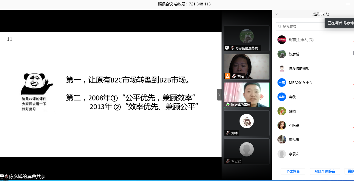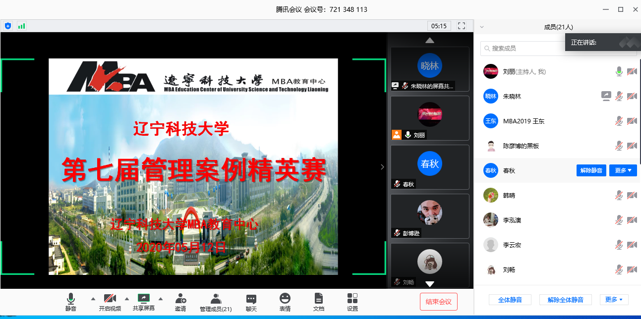 2020年5月9日晚,J9平台MBA教育中心第七届管理案例精英赛成功举行。2019级全体参加了此次比赛。MBA教育中心副主任朱晓林教授,校外导师邵岩、吕衍国,管理综合案例课程任课老师李云宏、刘丽担任此次比赛评委。