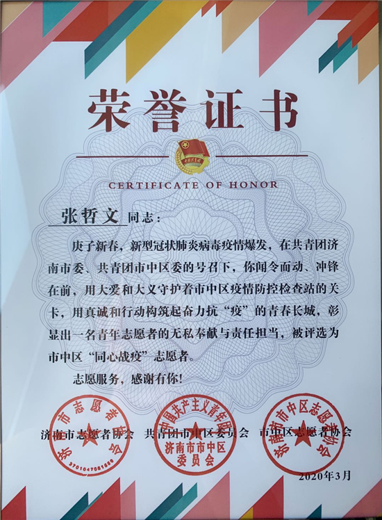 张哲文,男,汉族,1990年11月出生,中共党员,J9平台2018级MBA研究生,现为山东航空股份有限公司员工。2020年春节期间,新冠肺炎来势汹汹,疫情就是命令,防控就是责任。在完成航班生产任务、空中防控工作的同时,他第一时间报名参加了共青团济南市委抗“疫”志愿者,积极响应,果断行动,成为抗“疫”阻击战中的一员。