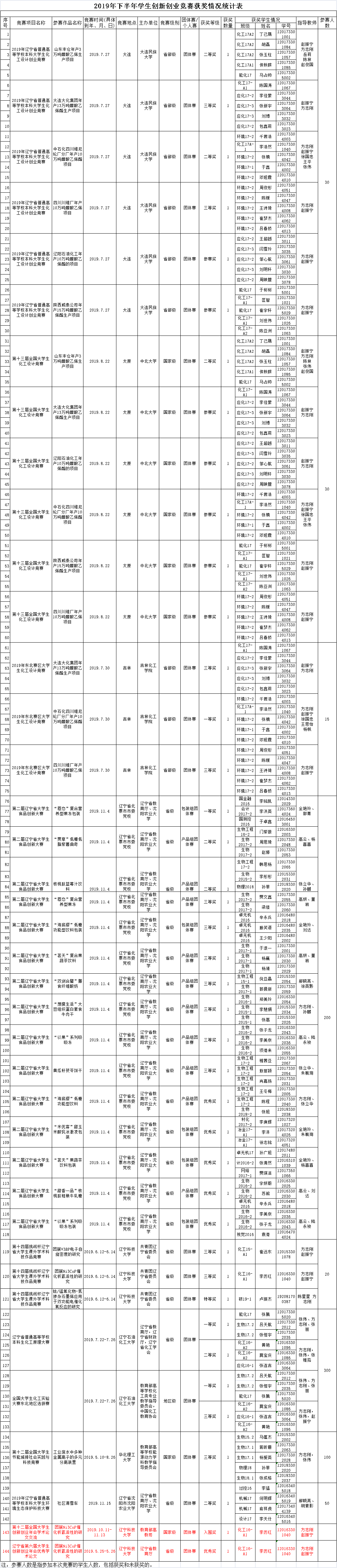 化工学院2019年下半年学生创新创业竞赛获奖情况统计表