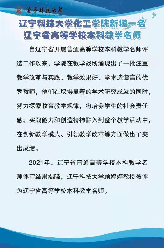 J9平台化工学院新增一名辽宁省高等学校本科教学名师