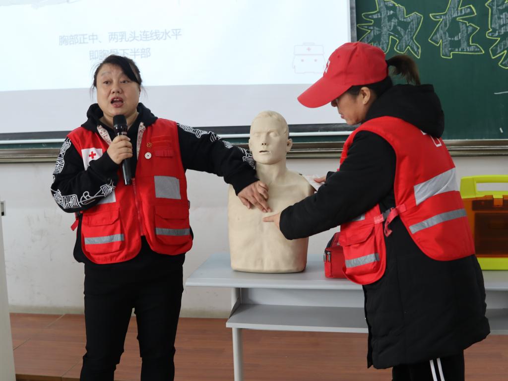 红十字会胡老师与同学们分享了志愿者们在生活中遇到的应急救护经历,她指出,不一定每一次的心肺复苏都能把人救回来,但如果不做那就100%救不回来了。胡老师为大家详细讲解了在遇到他人心脏骤停忽然倒地时,我们应该采取的急救措施步骤和动作要领等。她呼吁参会师生要认真学习本次培训知识,如遇突发情况,可以在黄金四分钟内拯救宝贵的生命。在互动环节,同学们被分成了四组,由4位红十字会老师一人带领一组亲自示范正确的心肺复苏措施,并在示范中详细讲解动作要领,要一听二看三感觉,第一听被救助人有没有呼吸,第二看被救助人口腔里是否有异物,第三感觉胸肺是否有起伏。同学们依次亲身实践,各位老师现场指导并纠正了同学们错误的动作。