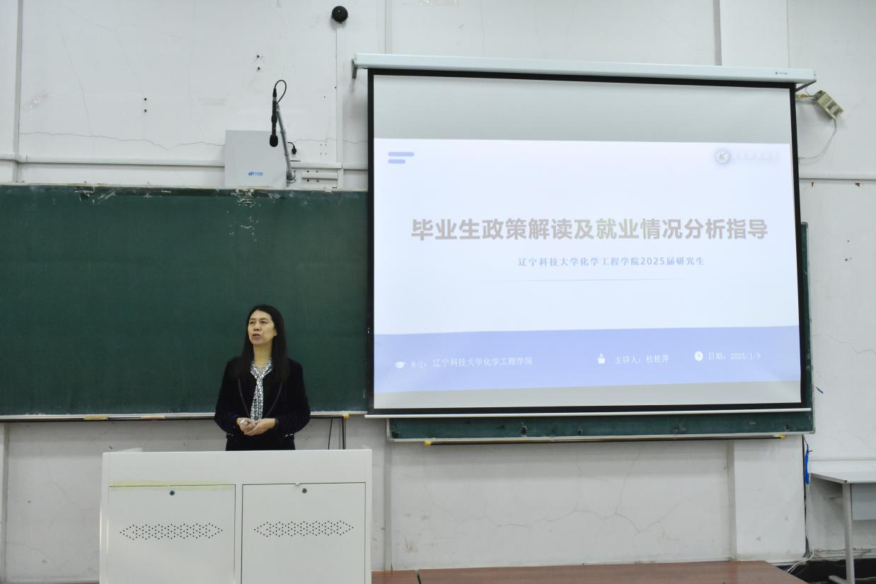 其次,辅导员杜桂萍老师,针对毕业生目前国家就业政策及形势、政策解读指导。她首先分析当前的国家高校就业形势,2025届全国高校毕业生规模预计1222万人,同比增加43万人。目前化工学院2025届毕业生环比上届就业率呈下降趋势,同学们利用假期必须主动出击,积极拓展用人市场,有针对性谋求就业岗位,学院、学校也会积极推进2025届毕业稳就业、稳岗位,推动学生及时就业。