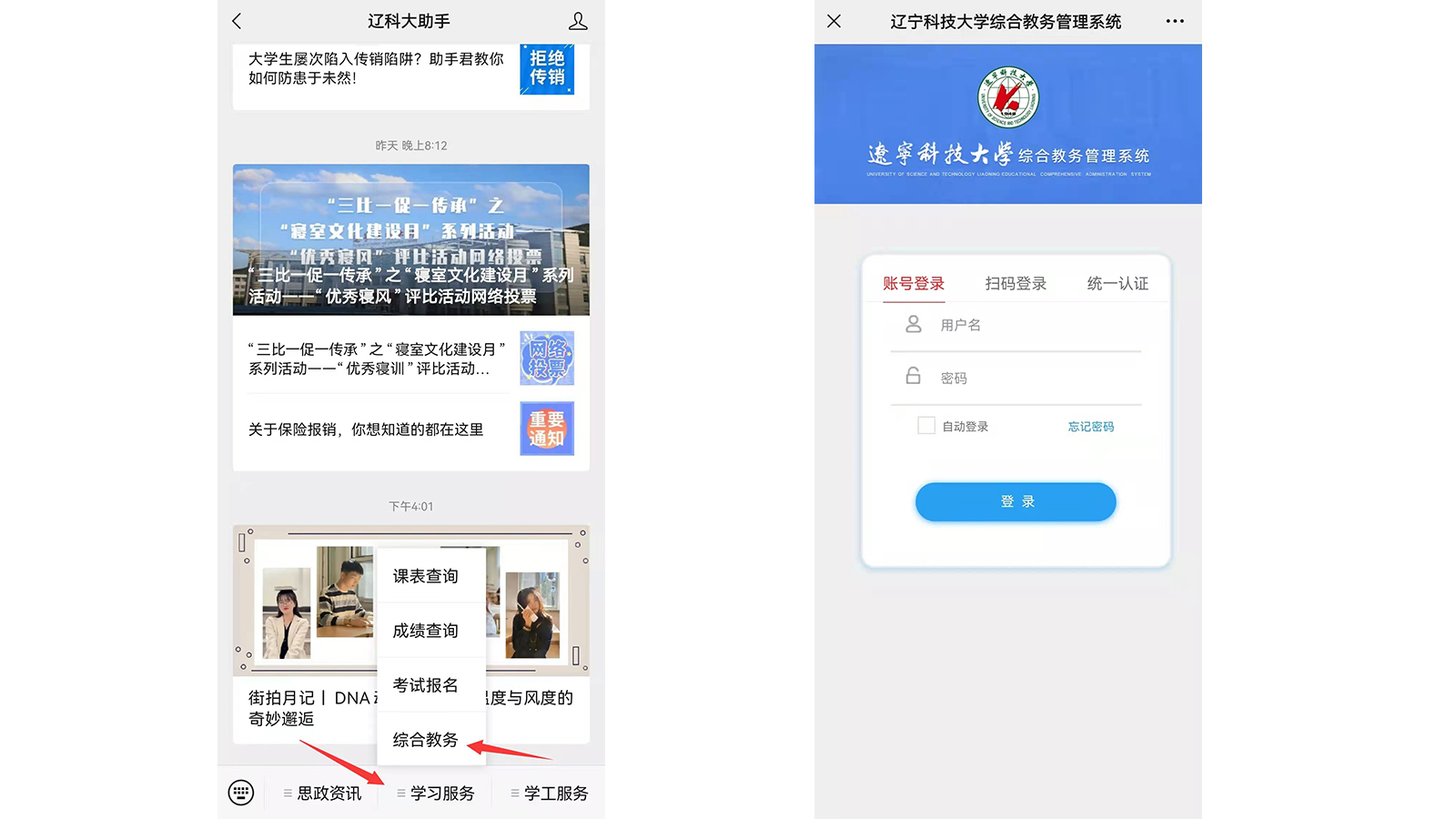 1.点击下方菜单栏中的“学习服务”栏目,再点击“综合教务”。