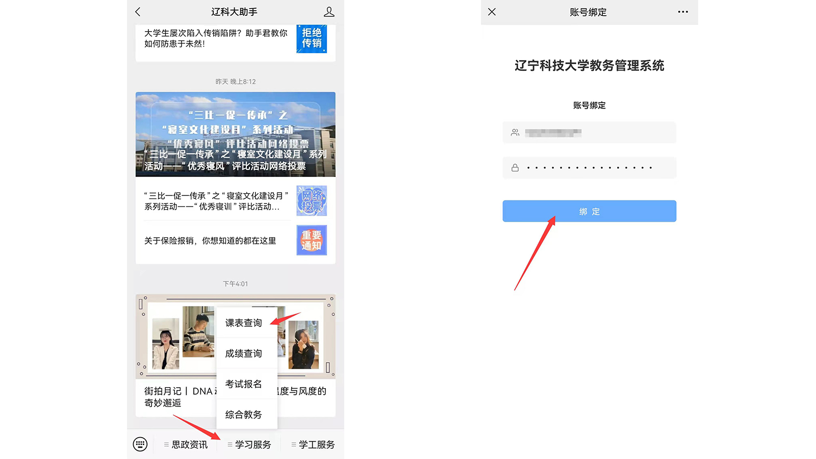 2.在跳转的页面中输入账号密码,输入完毕后点击“绑定”,进行账号绑定,跳转页面即为课表、成绩页面。