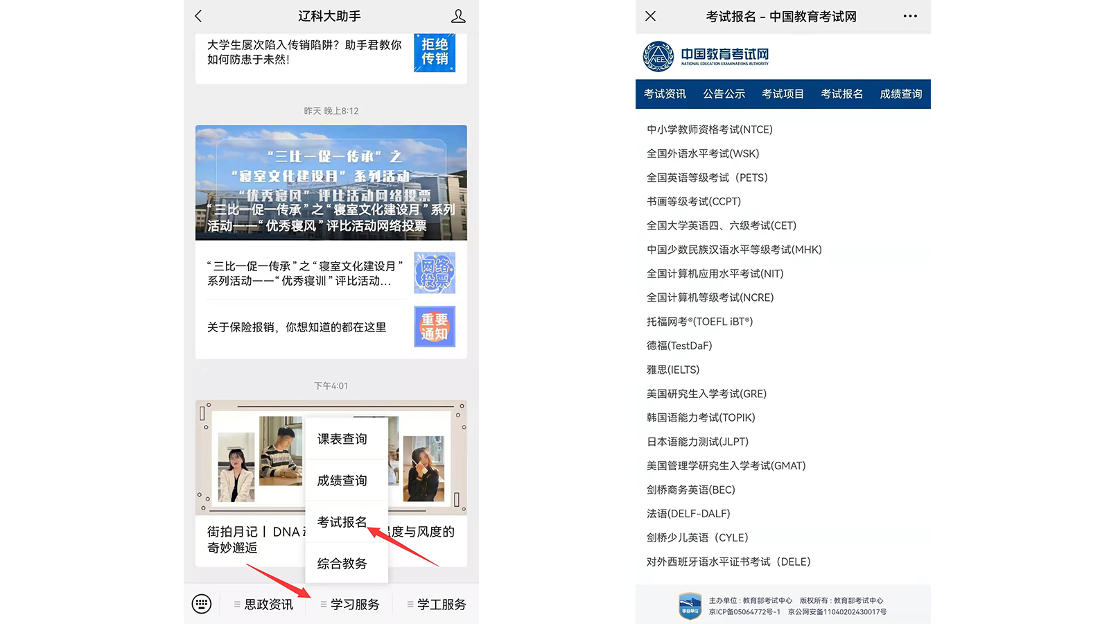 1.点击下方菜单栏中的“学习服务”,再点击“考试报名”。