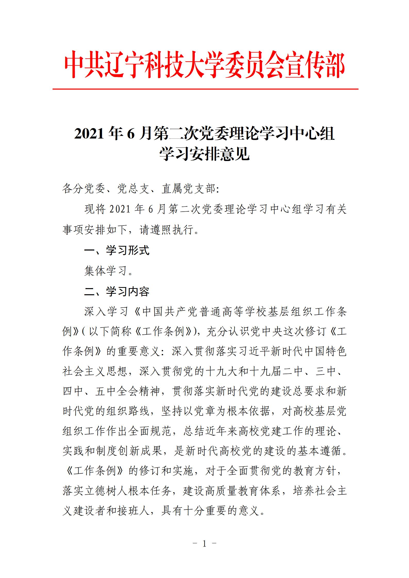 2021年6月第二次党委理论学习中心组学习安排意见
