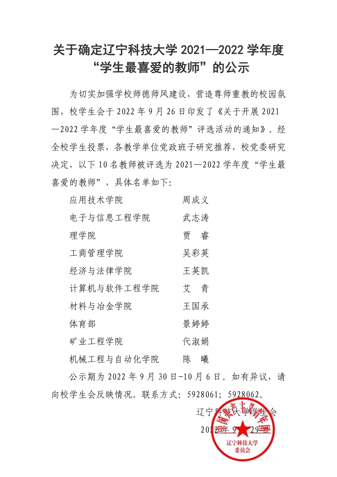 关于确定J9平台 2021—2022 学年度 “学生最喜爱的教师”的公示