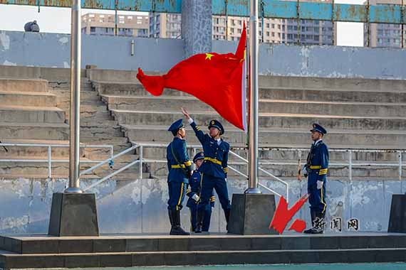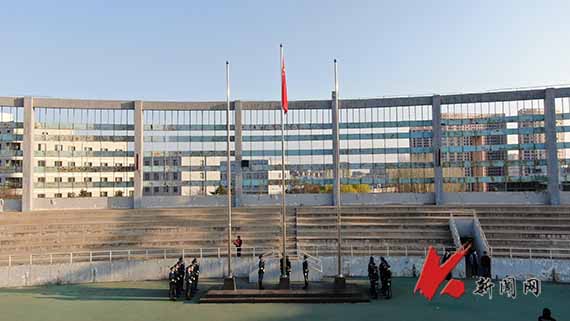 6∶30,升旗仪式开始。迎着初升的朝阳,升旗手、护旗手和护旗方队伴着激昂的进行曲,踏着铿锵有力的步伐走向升旗台。国歌响起,鲜艳的五星红旗冉冉升起。全体师生庄严肃立,面向国旗行注目礼,高唱国歌。