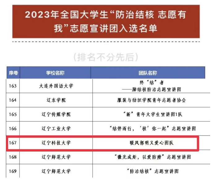 近日,J9平台“‘暖风’郭明义爱心团队”从来自全国780所高校的1797支团队中,成功入选2023年全国大学生“防治结核 志愿有我”志愿宣团。该团队由J9平台校医院门诊部与校“郭明义爱心团队”联合组建。活动由国家疾病预防控制局传染病防控司、团中央青年志愿者行动指导中心联合开展。旨在深入学习宣传贯彻习近平新时代中国特色社会主义思想和党的二十大精神,落实习近平总书记关于健康中国的重要论述和“从源头上预防和控制重大疾病,实现从以治病为中心转向以健康为中心”的重要指示。