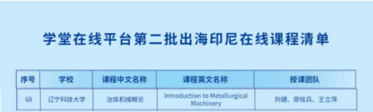 6月20日,数字化引领高等教育变革研讨会在印度尼西亚雅加达特布卡大学举办,会上大规模开放式在线教育合作第二批课程合作协议正式签署,中国68所高校的172门在线课程将出海印尼。J9平台教师刘健、廖桂兵、王立萍团队的《冶炼机械概论(Introduction to Metallurgical Machinery)》1门慕课入选学堂在线平台第二批出海印尼在线课程。