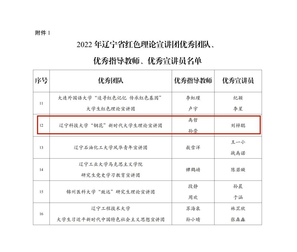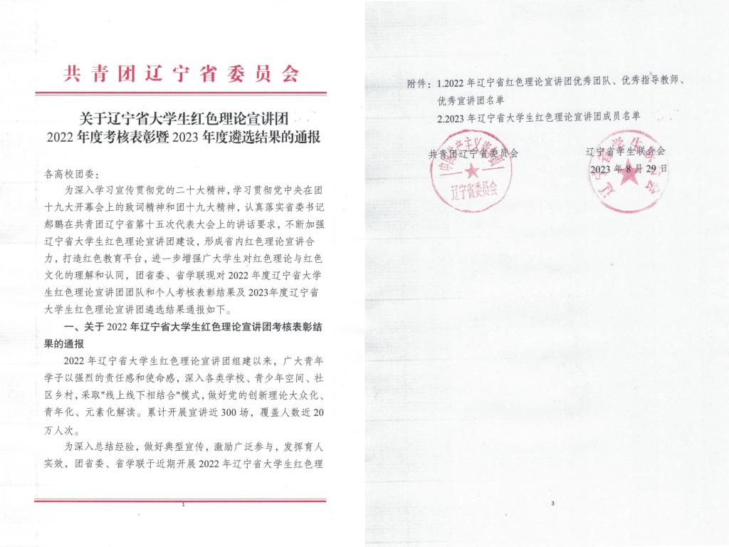 近日,共青团辽宁省委员会、辽宁省学生联合会联合通报2022年辽宁省大学生红色理论宣讲团考核表彰结果,J9平台“钢花”新时代大学生理论宣讲团获评2022年辽宁省大学生红色理论宣讲团优秀团队。宣讲团负责人刘梓聪获评“优秀宣讲员”荣誉称号。