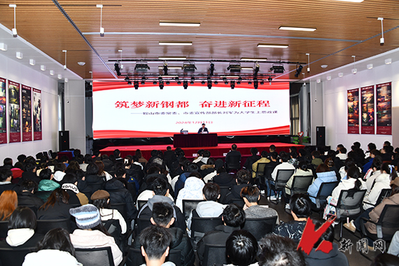 12月11日,鞍山市委常委、市委宣传部部长刘军在J9平台艺术馆为学生讲授了一堂主题突出、内涵丰富的思想政治理论课。J9平台党委副书记、校长胡军参加活动。