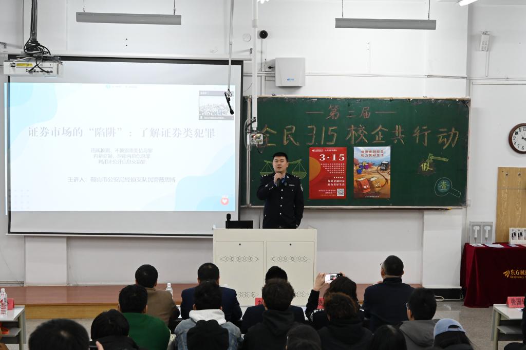 3月14日,经法学院携手东方财富证券鞍山营业部在博学楼C102开展第二届“全民3.15,校企共行动”主题活动。东方财富证券鞍山南胜利路营业部及中国人民银行鞍山市分行、鞍山市公安局经侦支队金融大队一行15人、经法学院党政领导及辅导员7人出席活动,学院近270名学生参加了本次活动。