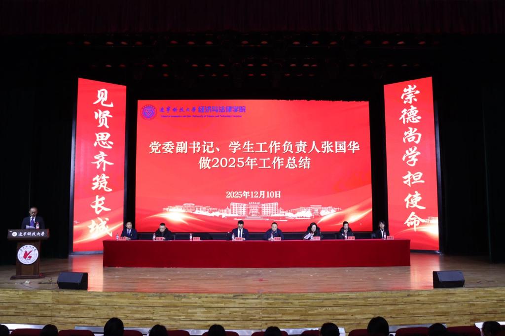 12月10日,经法学院在校礼堂隆重举行2025年度学生工作表彰大会。会议由经法学院党委书记赵智博主持,院长郭浩淼、党委副书记张国华、副院长邵玲、副院长温馨、金融科技系主任郭威、学办主任李路云、团委书记张鹏飞及2023、2024、2025级全体学生参加。