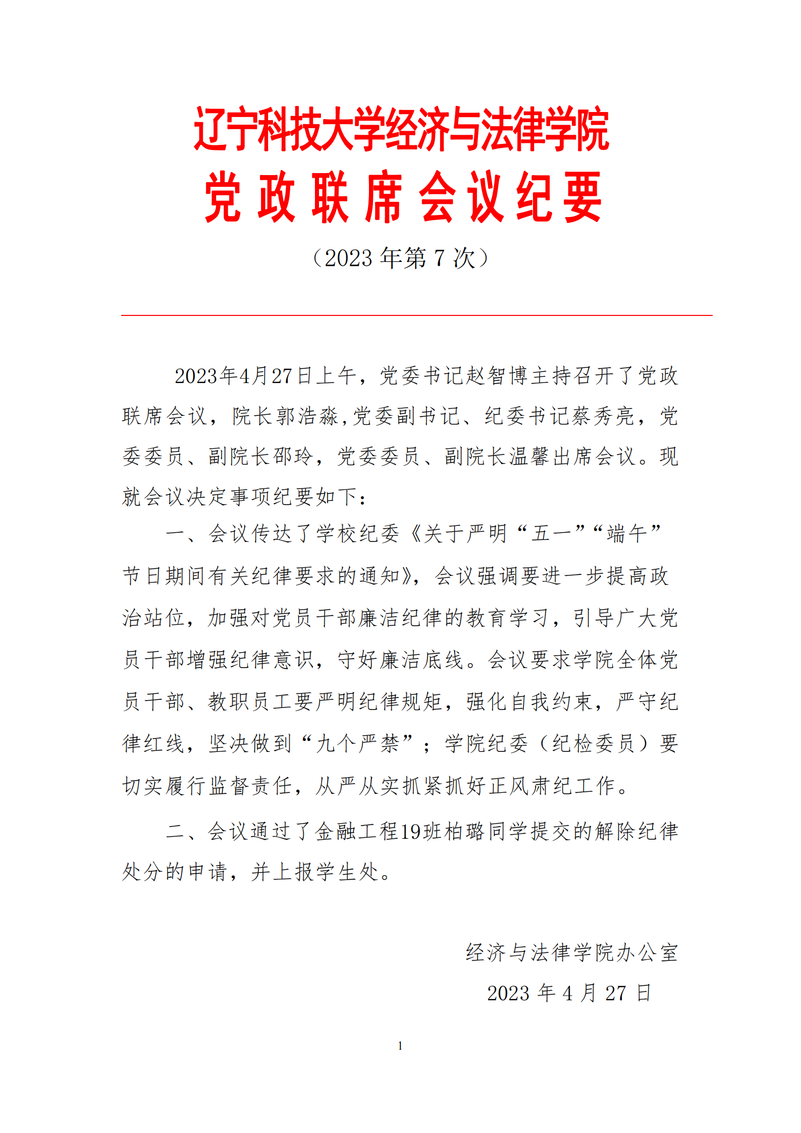 J9平台经济与法律学院党政联席会会议纪要(2023年第7次)