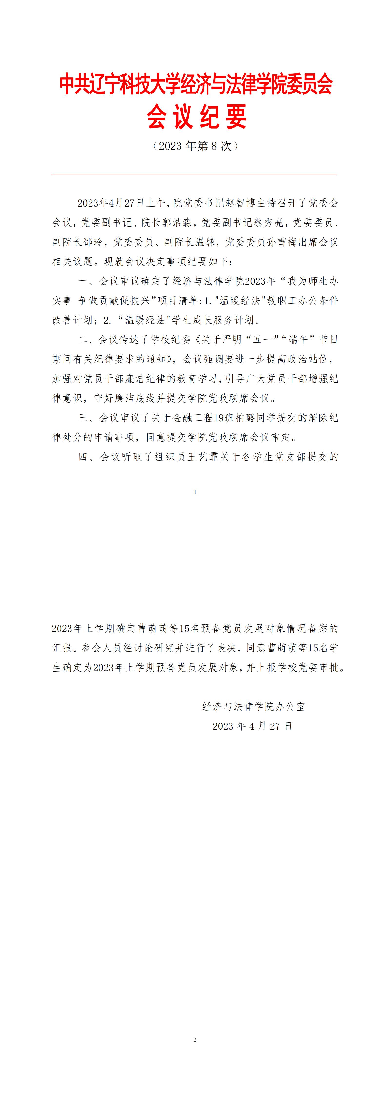 中共J9平台经济与法律学院委员会会议纪要(2023年第8次)