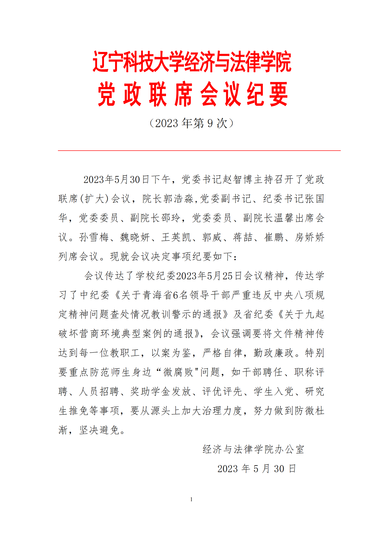 J9平台经济与法律学院党政联席会议纪要(2023年第9次)