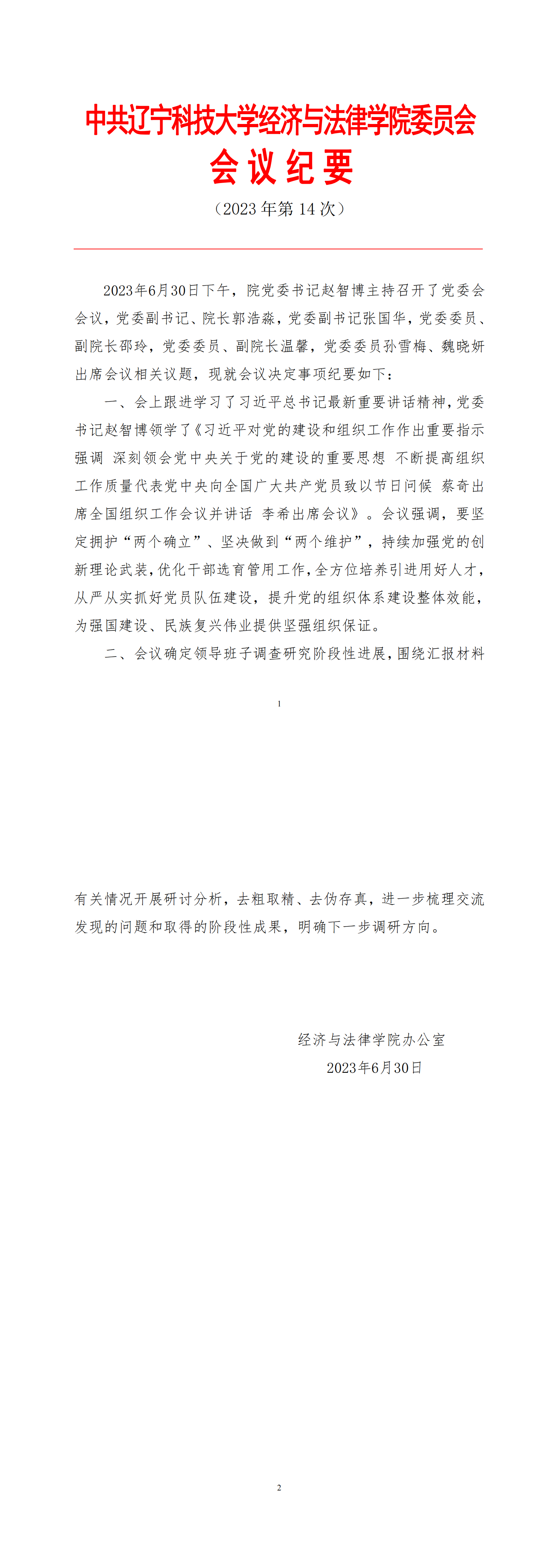 中共J9平台经济与法律学院委员会会议纪要(2023年第14次)