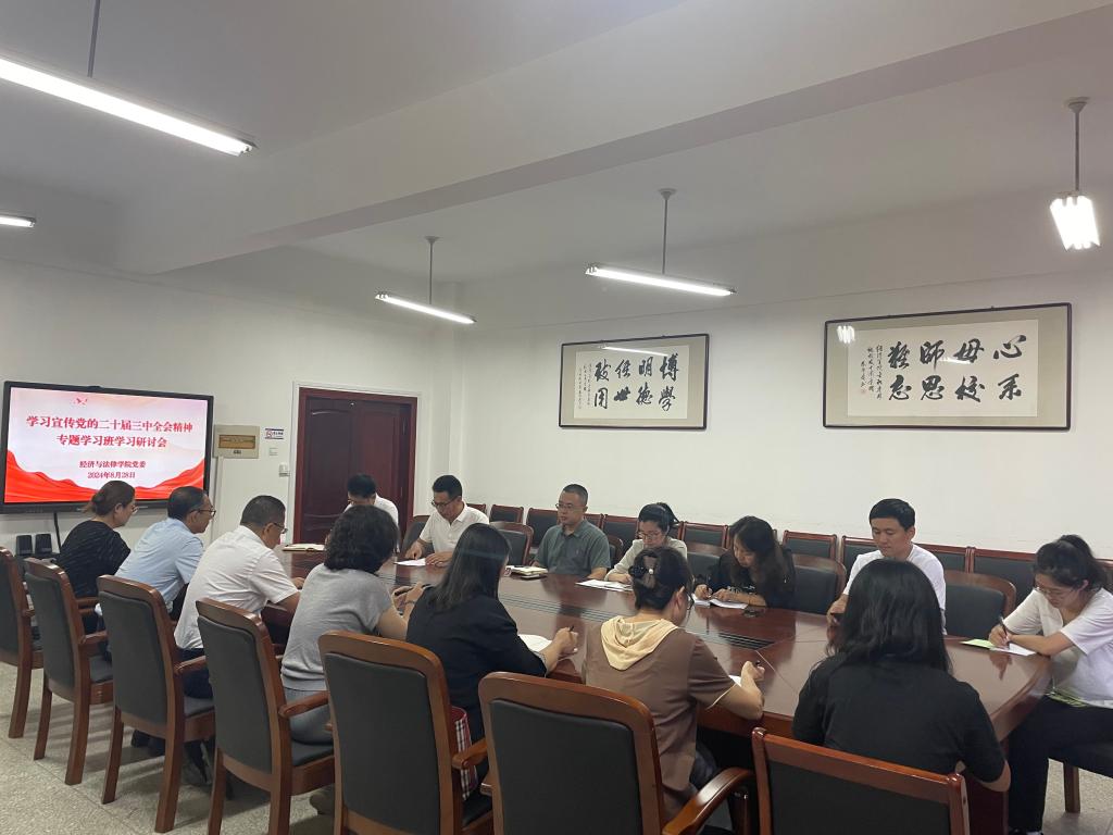 8月28日下午,经法学院在博识楼A305召开党的二十届三中全会精神专题学习研讨会。会议由学院党委书记赵智博主持,学院副科级以上领导干部、党支部书记、系主任和民主党派教师代表参加了会议。会议围绕党的二十届三中全会关于进一步全面深化改革、推进中国式现代化的重大意义和总体要求,聚焦教育科技人才体制机制一体改革,深入开展学习研讨。