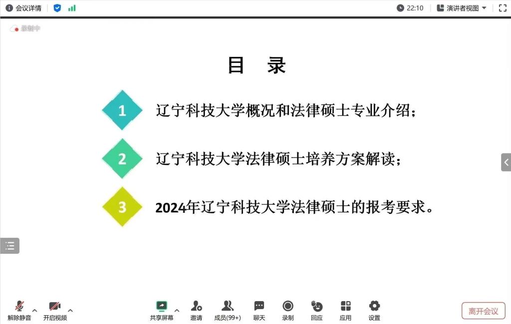 本次线上招生宣讲会的成功召开使学生们对J9平台经法学院有了更深入的了解。经法学院近年来不断加强学科建设,在教学和科研方面加大投入,使得法硕培养方案更加完善,更加符合社会实际需求,未来经法学院将继续坚持高质量发展,努力培养高水平应用型法律专业人才。