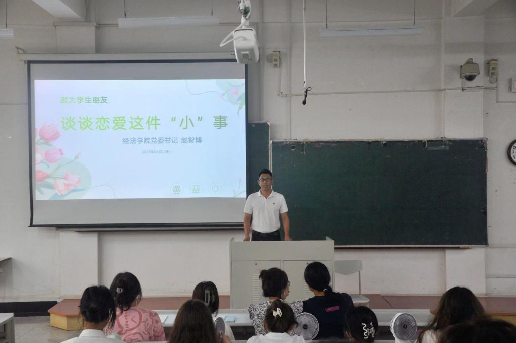6月29日,经法学院党委书记赵智博于博学楼A101以“谈谈恋爱这件‘小’事”为题开展专题讲座,学院党委副书记张国华出席,2022级全体学生听取了讲座。