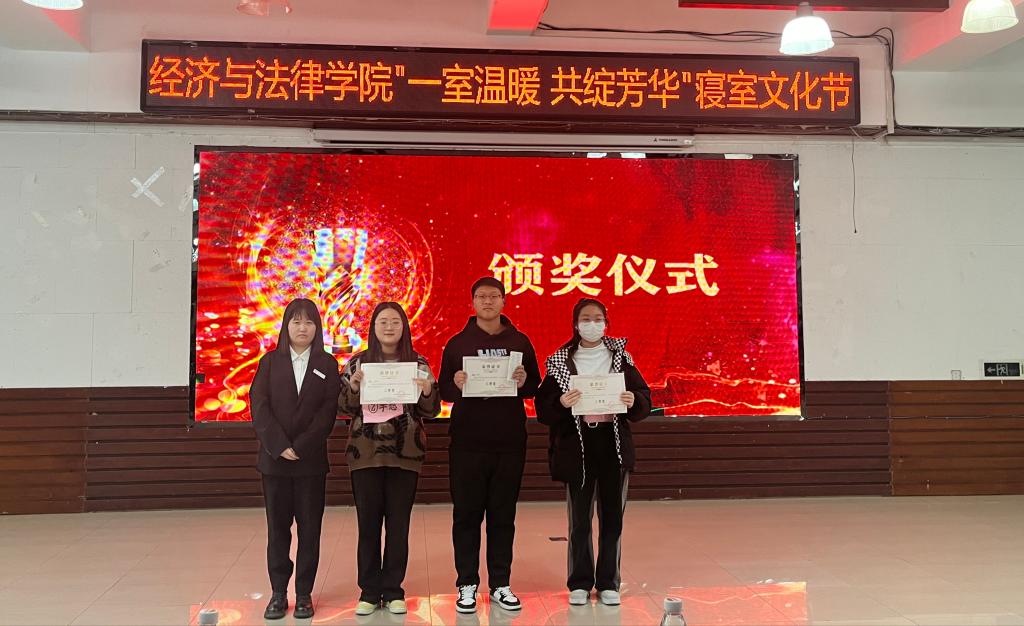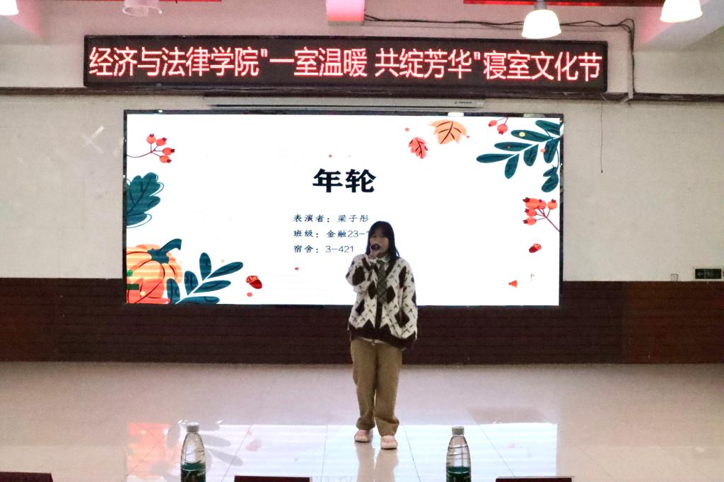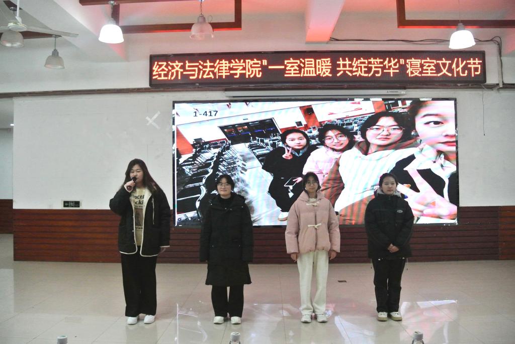 活动中,Vshow舞团开场的精彩表演点燃了观众的热情,现场气氛瞬间升温,活动正式拉开序幕。本次寝室文化节共分为“寝室vlog大赛”“才艺大赛”和“叠被子大赛”三个环节。随着全场热烈的掌声,“寝室vlog大赛”将各参赛寝室成员们精彩纷呈的寝室生活呈现在观众眼前。选手们通过照片、视频、采访等各种各样的形式记录了寝室成员之间的点点滴滴,展现了寝室生活的温馨日常以及各寝室成员们独特的闪光点。“才艺大赛”上,选手们各显神通,给观众带来了一场视听盛宴。小品《勇闯301》以诙谐的剧情、滑稽的动作让现场笑声不断;歌曲《年轮》、诗朗诵《面朝大海,春暖花开》、舞蹈串烧等表演以充沛饱满的情感诠释了经法学子们积极向上、意气飞扬的寝室风采,体现了寝室成员们热情奔放的精神面貌,赢得了在场老师和同学们的阵阵掌声。修明武术协会和金融21班秦煜宁的串场表演以及“抱团游戏”将气氛再次推向高潮,现场欢呼喝彩声不断。“叠被子大赛”环节中,随着主持人一声令下,参赛同学迅速进入状态,即便两位主持人不断提问干扰,选手们依然细致认真地整理被子,现场气氛热烈,欢呼不断。两分钟后,一块块棱角分明的“豆腐块"展现在观众面前,赢得了观众的热烈掌声。由韦敏玲、何运来、周思彤为大家带来的舞蹈串烧,表演精彩绝伦,令人印象深刻。