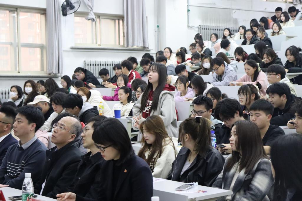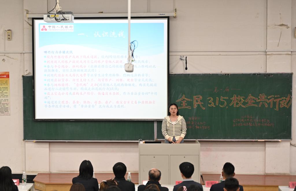 活动伊始,中国人民银行鞍山分行副行长刘纪首先致辞,随后由东方财富证券鞍山营业部工作人员姜英东作《走进基金的世界,开启我的第一堂基金课》主题宣讲。中国人民银行科员韩玮为同学们普及了反洗钱常识及对应的公民义务,带领大家了解到什么是洗钱、洗钱相关法律法规、洗钱的危害以及反洗钱监管体制等,并通过洗钱案例警示大家远离洗钱,勇于举报洗钱活动。随后易方达基金公司代表向同学们介绍了基金从业和职业生涯规划等方面的内容,并从自身出发,分享职业经历,让同学们对基金运行和基金市场产生了更直观、更深入的认识。讲解过后,同学们针对当前基金环境和未来发展方向提出了自己的困惑和想法,代表们给予了耐心且详细的解答。最后,学院党委书记赵智博作总结发言,他首先对各企方代表的到来表达了感谢,宣布由东方财富证券鞍山营业部携手J9平台经法学院举办的第一届“全民3.15,校企共行动”活动正式开启,并表示此次活动在指导大学生就业实践方面具有重要意义,鼓励同学们积极参与其中,同时期待未来校企继续携手与时俱进,协同育人,实现双向奔赴。