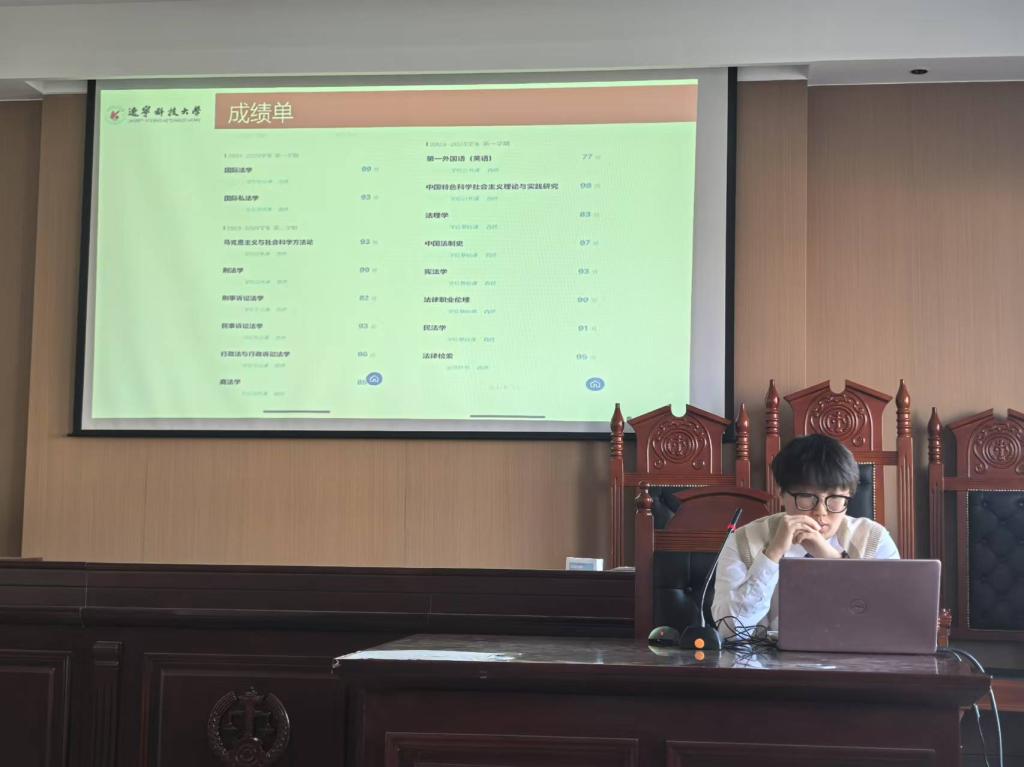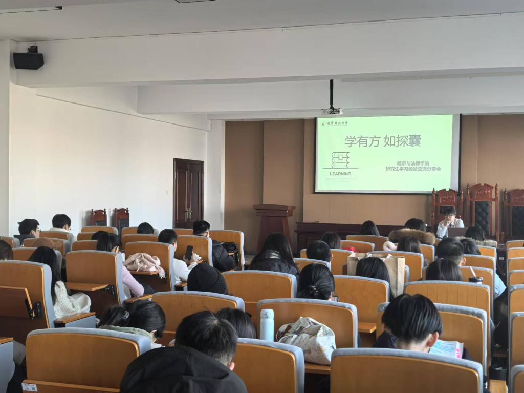 12月7日,经法学院于模拟法庭召开“学有方 如探囊”学习经验分享会。本次活动由2023级法律专业研究生项梦舒主讲,2024级全体研究生参加。