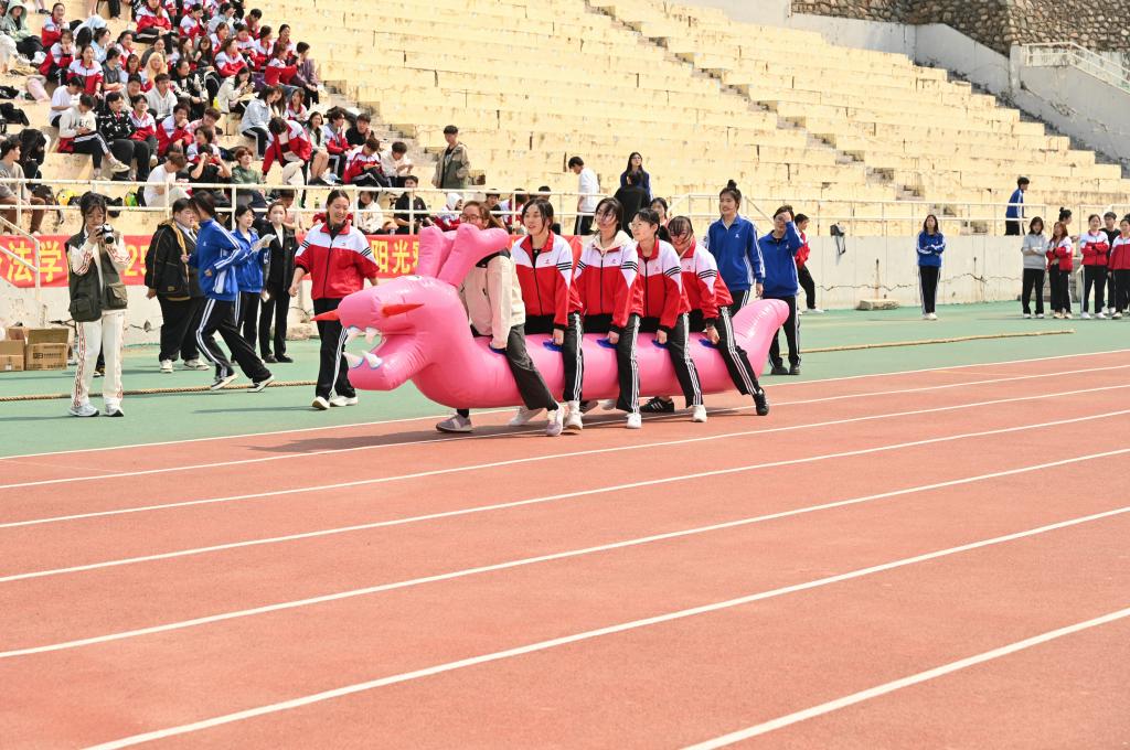 春风作伴,活力飞扬。4月15日下午,经法学院于主体育场举办2025年一站式学生社区“阳光寝室”趣味运动会。学院党委副书记张国华、团委副书记张鹏飞亲临现场,2024级全体同学展开激烈角逐,以蓬勃朝气展现青春风采,于协作拼搏中凝聚同窗情谊。