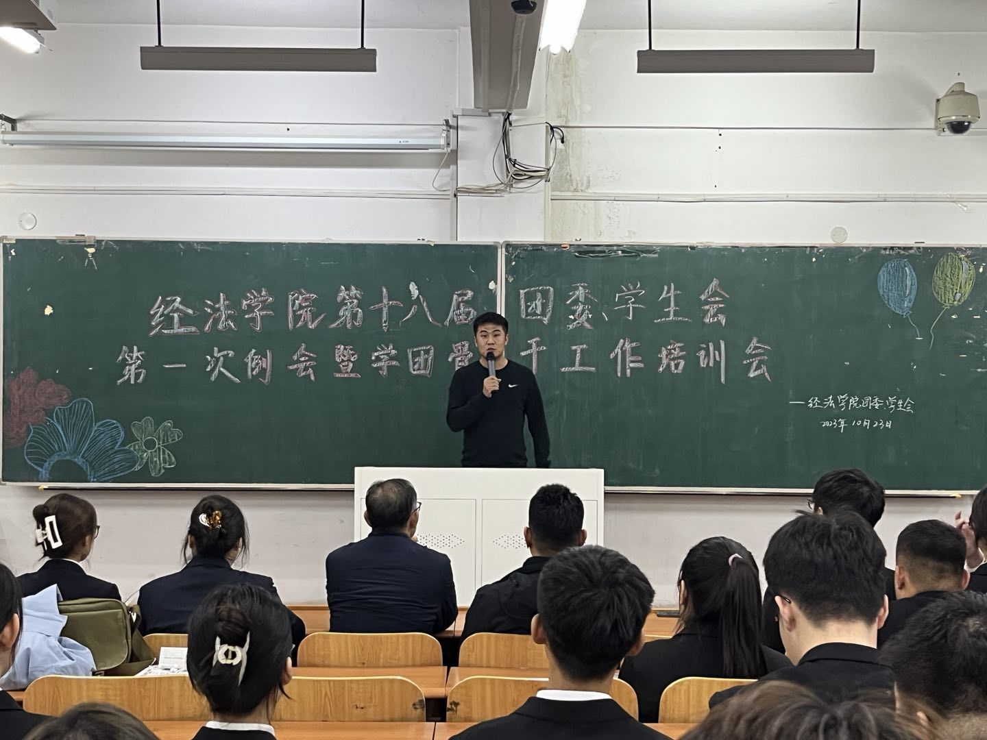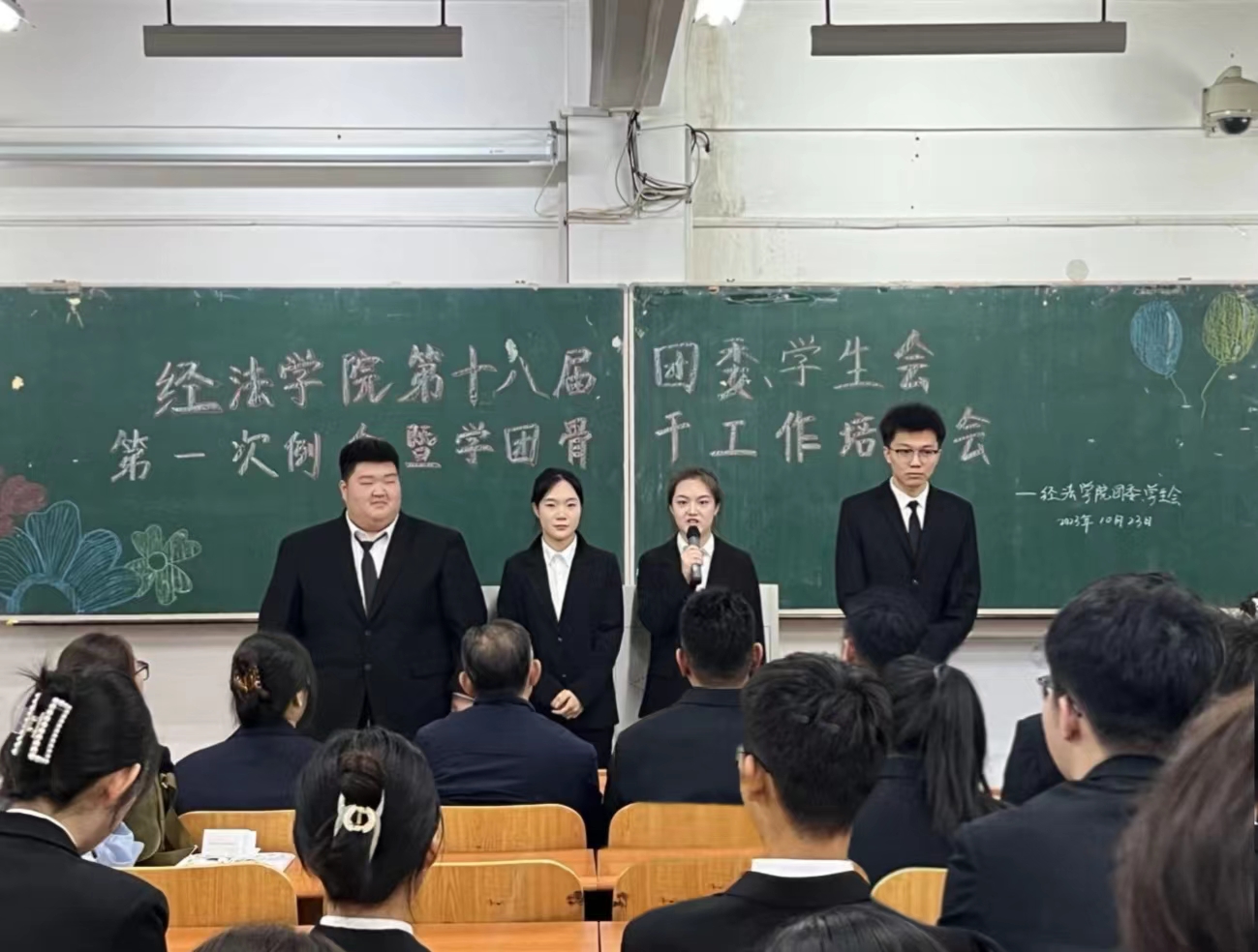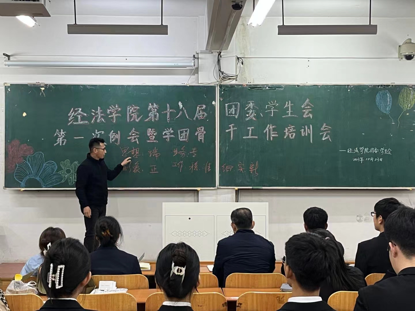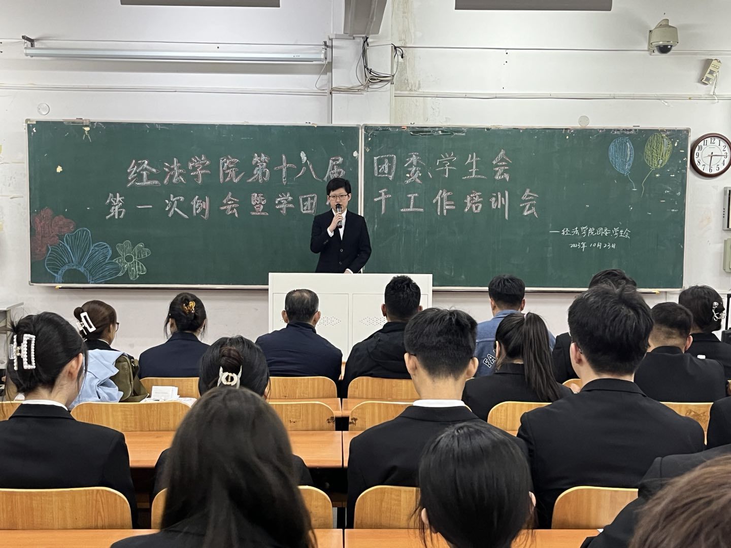10月23日下午,经法学院第十八届团委、学生会第一次例会暨学团骨干工作培训会在博学楼C112举行。学院党委书记赵智博、党委副书记张国华、团委副书记张鹏飞出席会议,经法学院学生会全体学团骨干参加了本次会议。会议由经法学院第十八届学生会执行主席兼办公室负责人吴雨纯主持。
