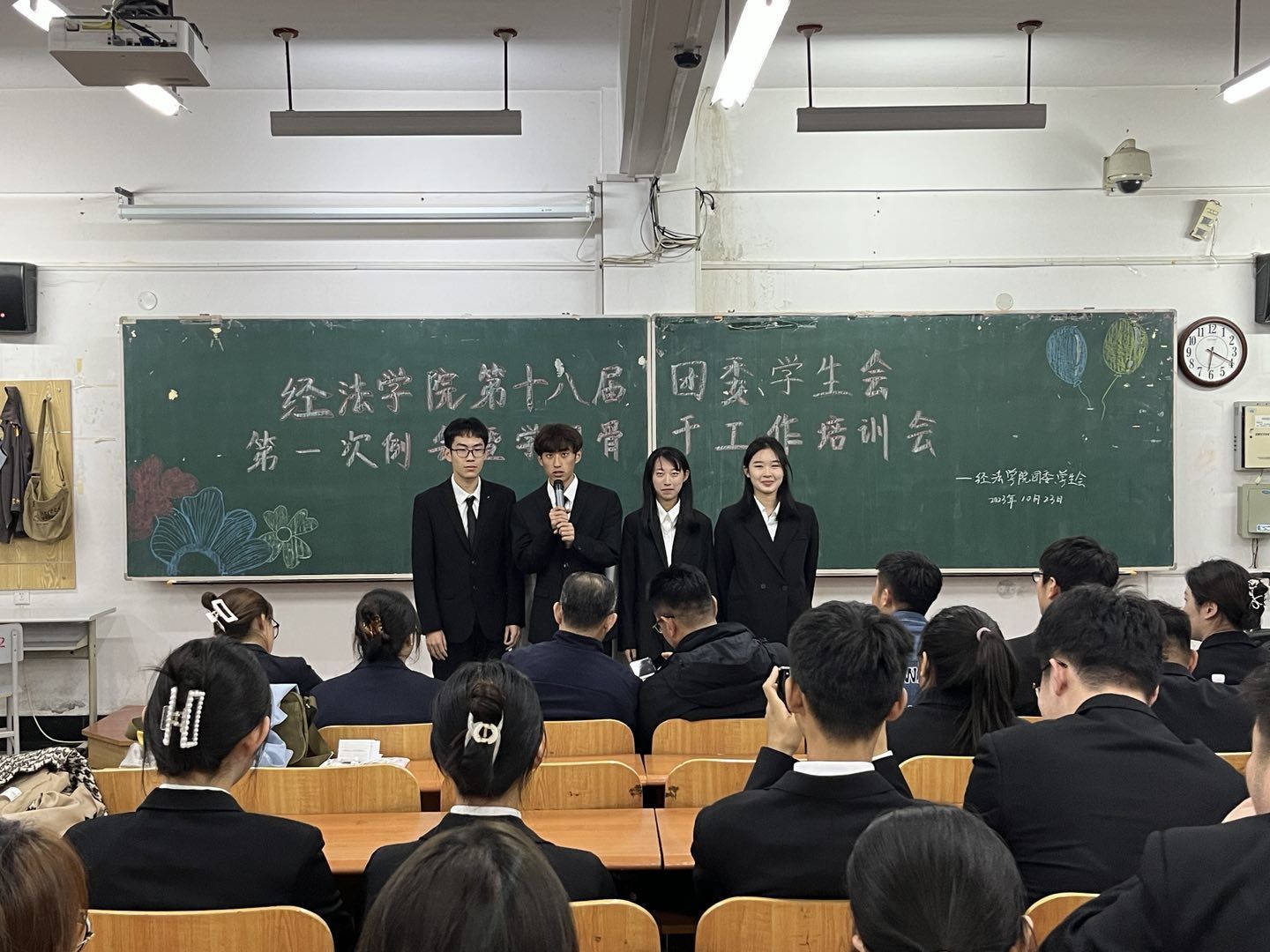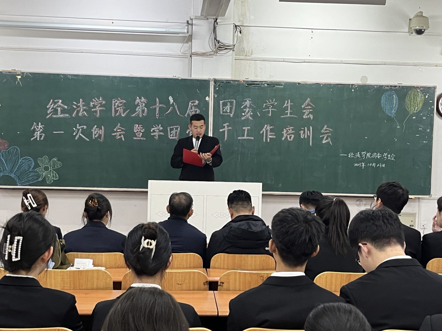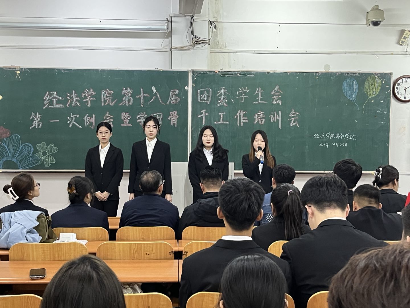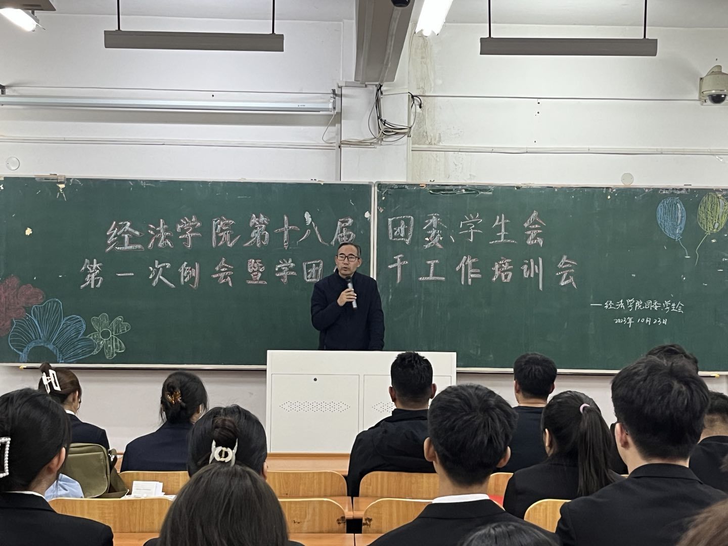 10月23日下午,经法学院第十八届团委、学生会第一次例会暨学团骨干工作培训会在博学楼C112举行。学院党委书记赵智博、党委副书记张国华、团委副书记张鹏飞出席会议,经法学院学生会全体学团骨干参加了本次会议。会议由经法学院第十八届学生会执行主席兼办公室负责人吴雨纯主持。