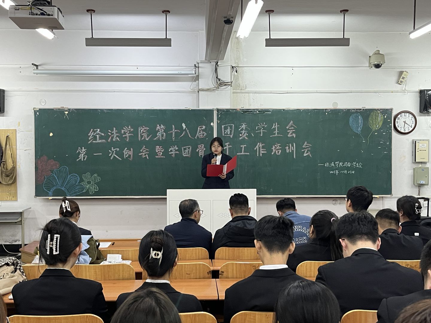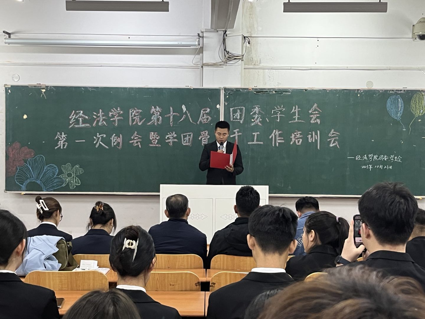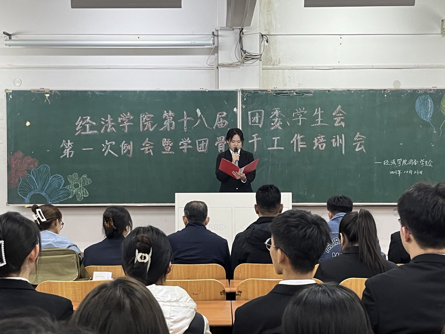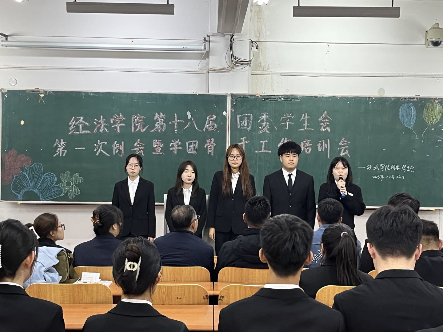 10月23日下午,经法学院第十八届团委、学生会第一次例会暨学团骨干工作培训会在博学楼C112举行。学院党委书记赵智博、党委副书记张国华、团委副书记张鹏飞出席会议,经法学院学生会全体学团骨干参加了本次会议。会议由经法学院第十八届学生会执行主席兼办公室负责人吴雨纯主持。