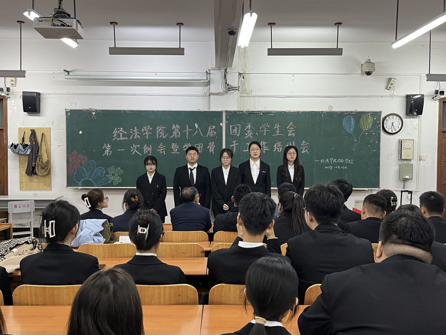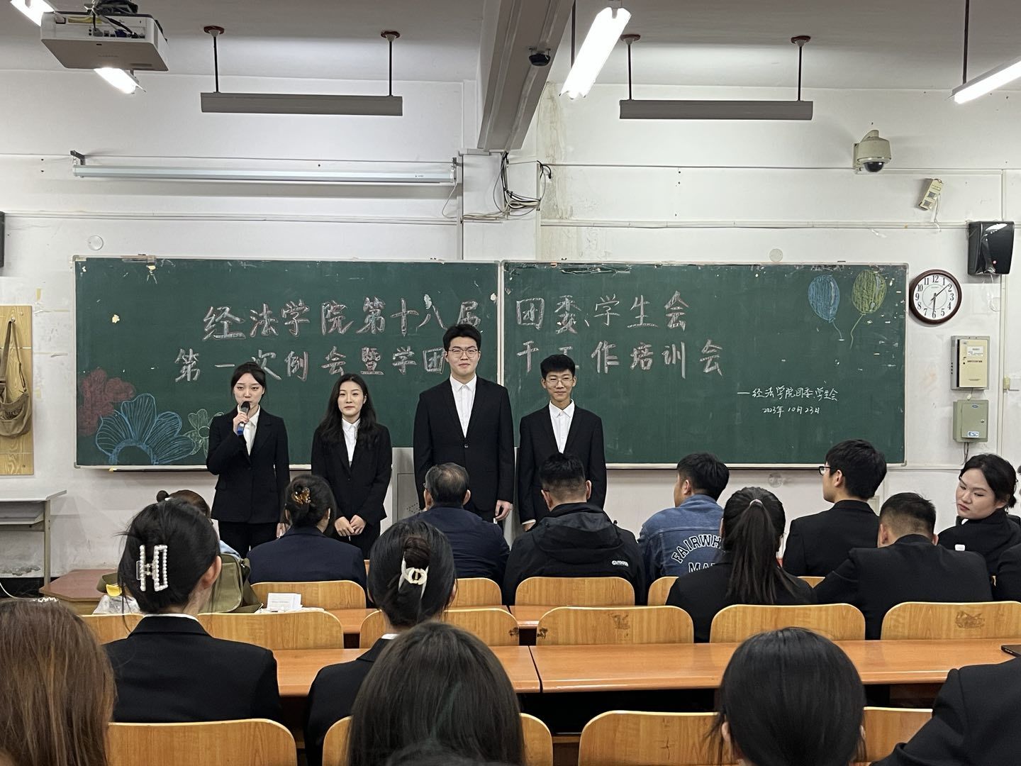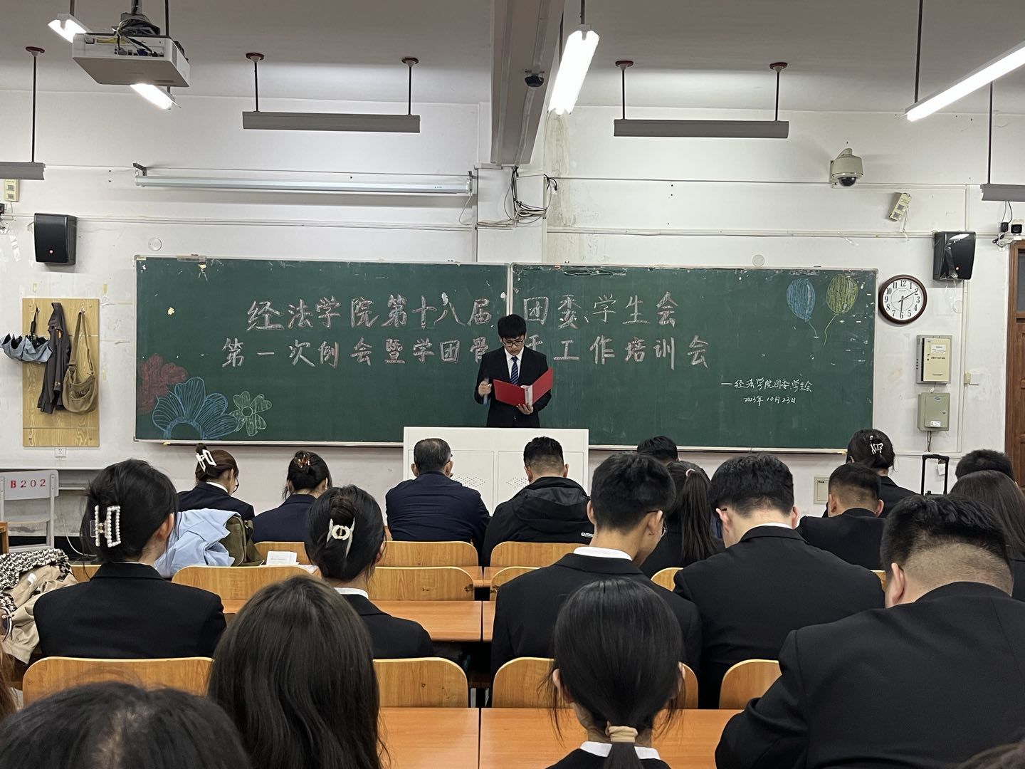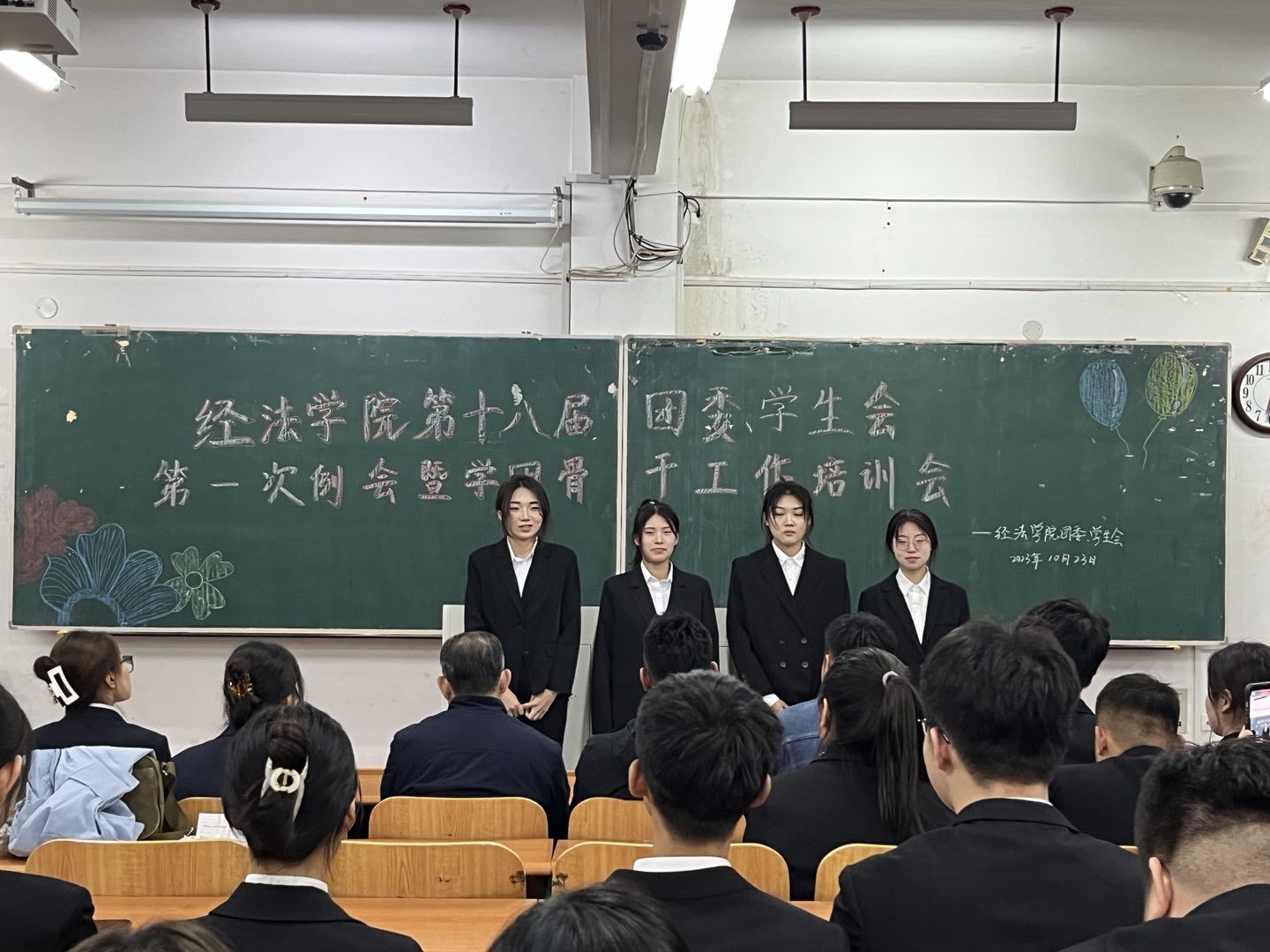 10月23日下午,经法学院第十八届团委、学生会第一次例会暨学团骨干工作培训会在博学楼C112举行。学院党委书记赵智博、党委副书记张国华、团委副书记张鹏飞出席会议,经法学院学生会全体学团骨干参加了本次会议。会议由经法学院第十八届学生会执行主席兼办公室负责人吴雨纯主持。