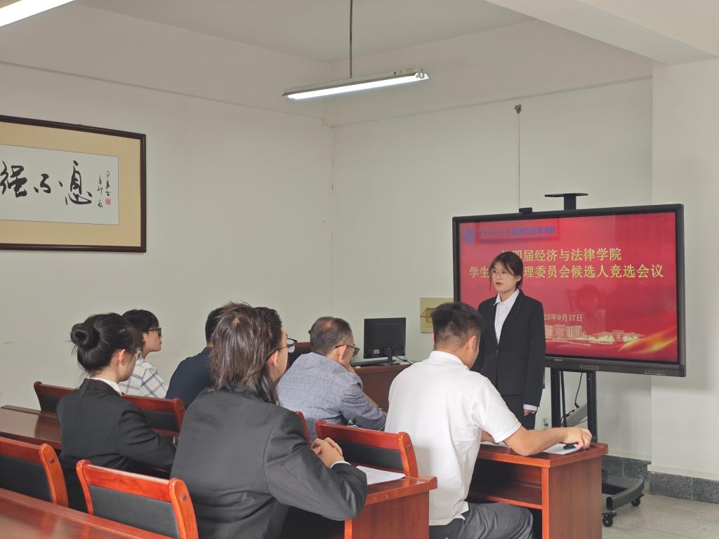 9月17日下午,经法学院于博识楼A313召开经法学院大学生自我管理委员会(以下简称“自管会”)换届竞选会议。会议由经法学院党委副书记张国华主持,学院党委书记赵智博、学办主任李路云以及团委书记张鹏飞出席会议,共有24名同学参与竞选。