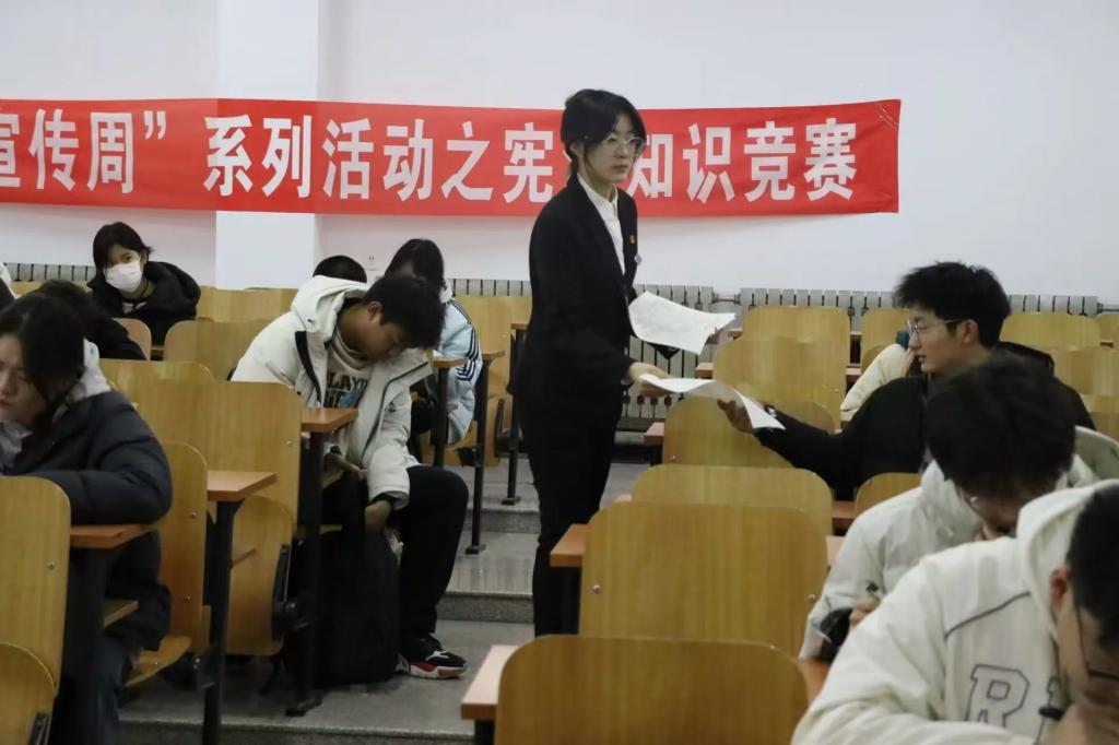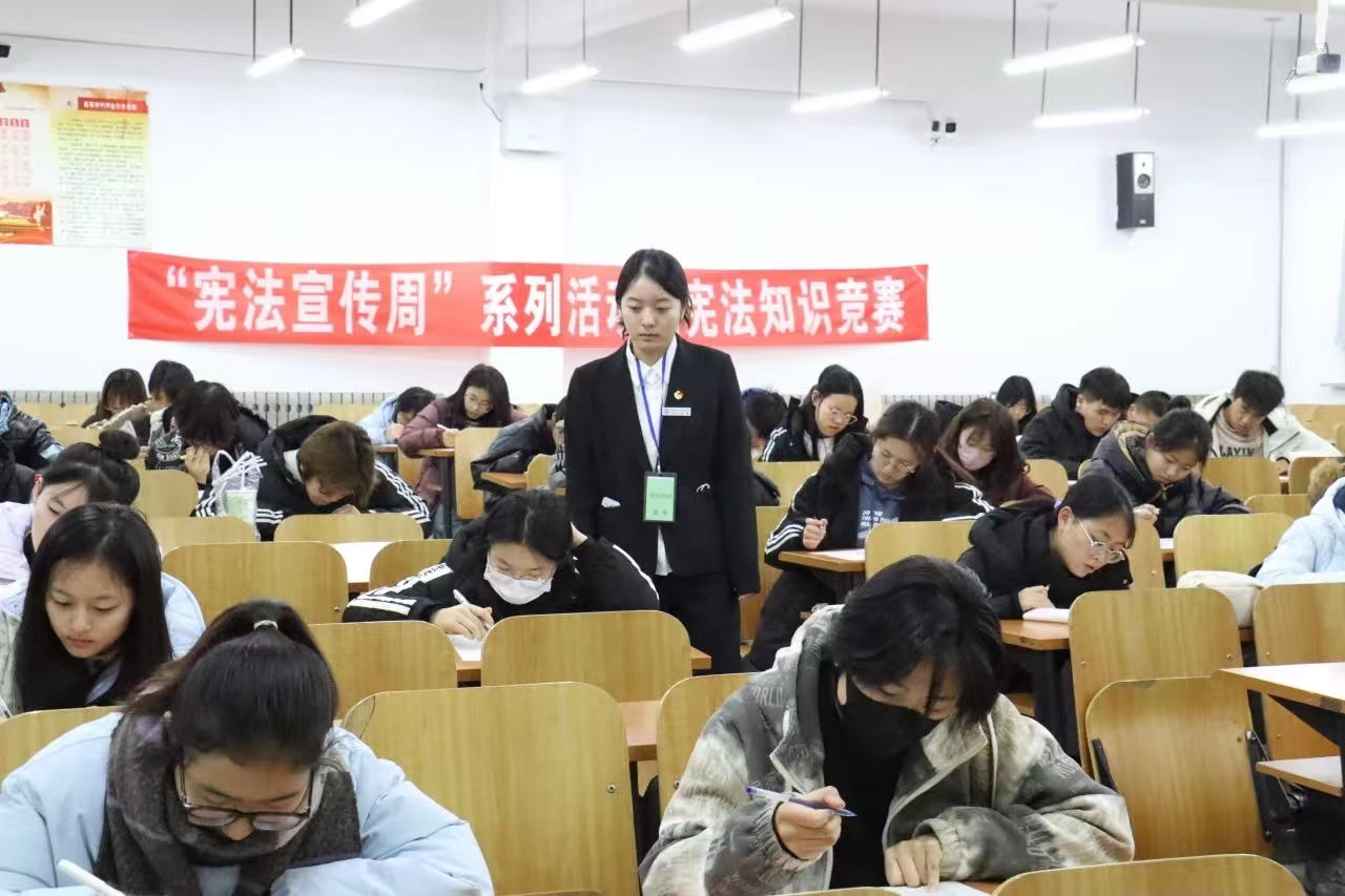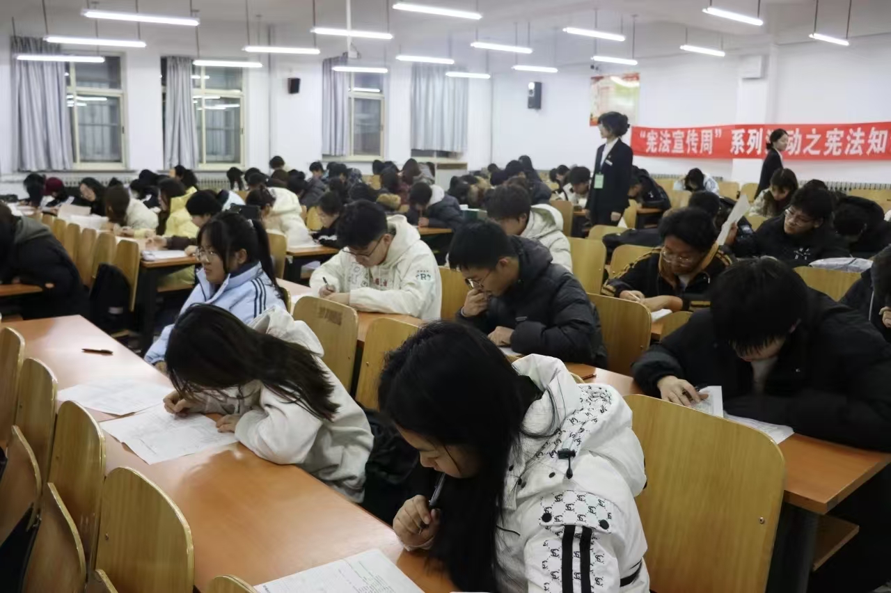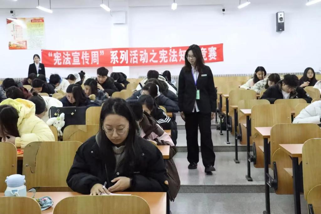 12月4日,经法学院于博学楼C112开展宪法知识竞赛。学院学生会主席团成员许秀、张涵及学生会办公室工作人员担任监考员,学院近100名同学参加了本次竞赛。