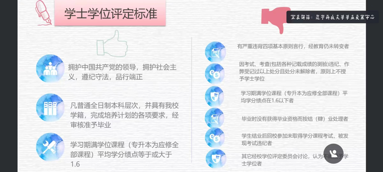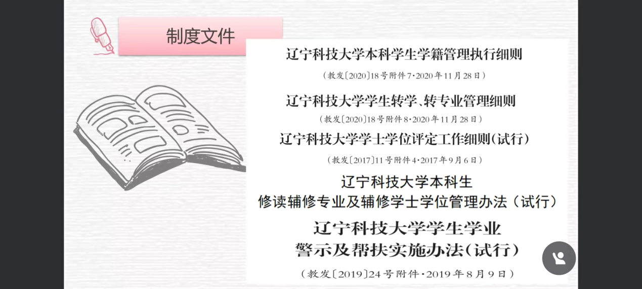 培训根据学生需求和关切,选取了《J9平台本科学生学籍管理执行细则》《J9平台考试工作管理规定(试行)》《J9平台大学生学业发展指导工作实施意见(试行)》等10个教学管理制度文件,重点围绕学籍学位、考试和选课、学业发展三大方面为学生进行制度解读,使信息员同学对学习过程中应知的相关管理规定和要求有更清晰的认识,以便为学生学业发展提供更好的支持和服务。